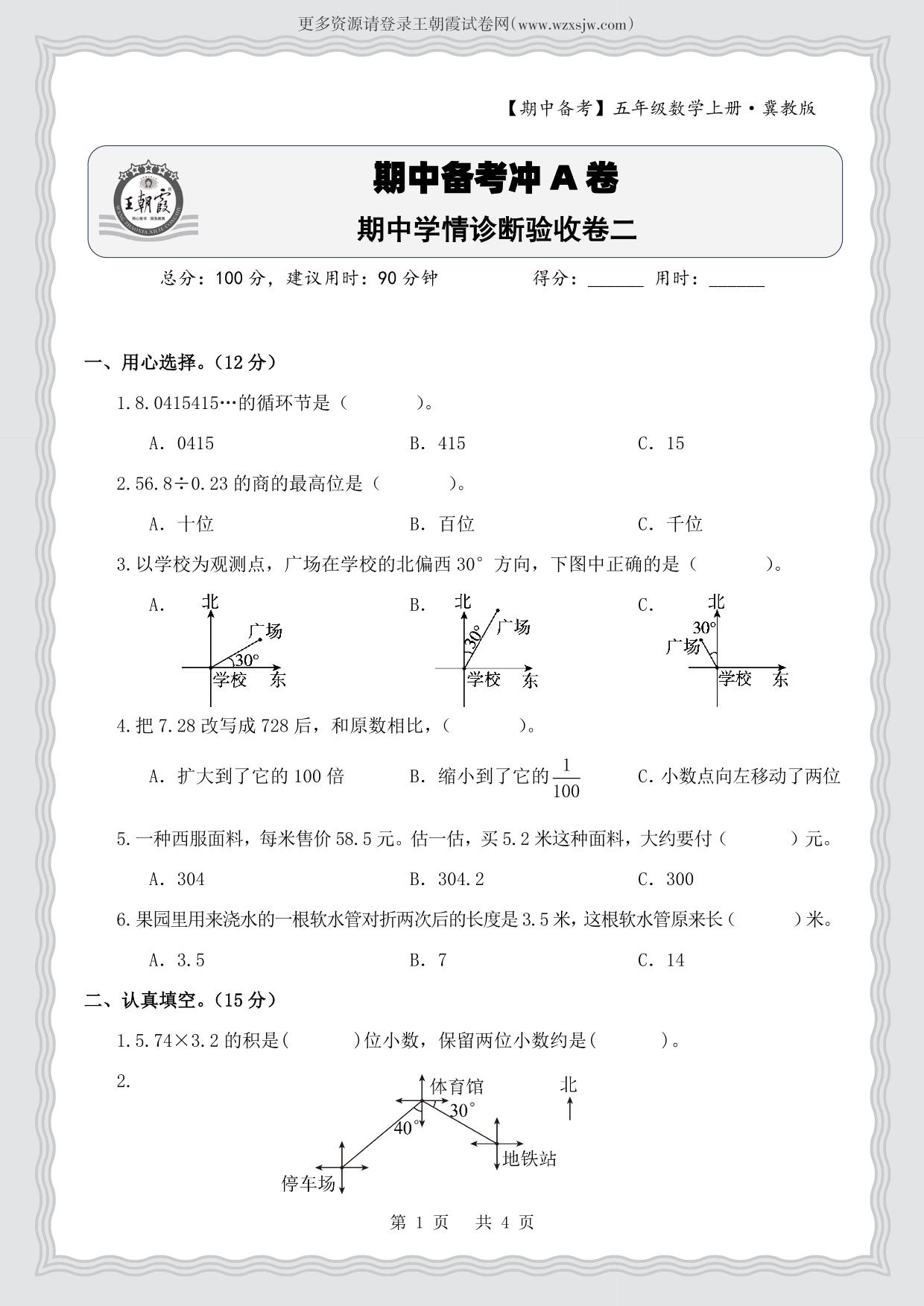 【期中备考】五年级数学上册冀教版·期中学情诊断验收卷二