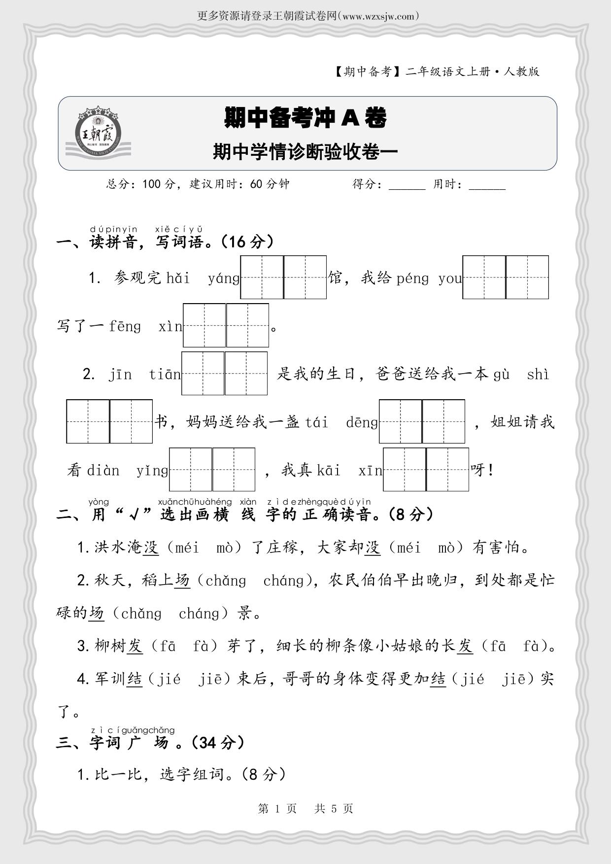【期中备考】二年级语文上册人教版·期中学情诊断验收卷一
