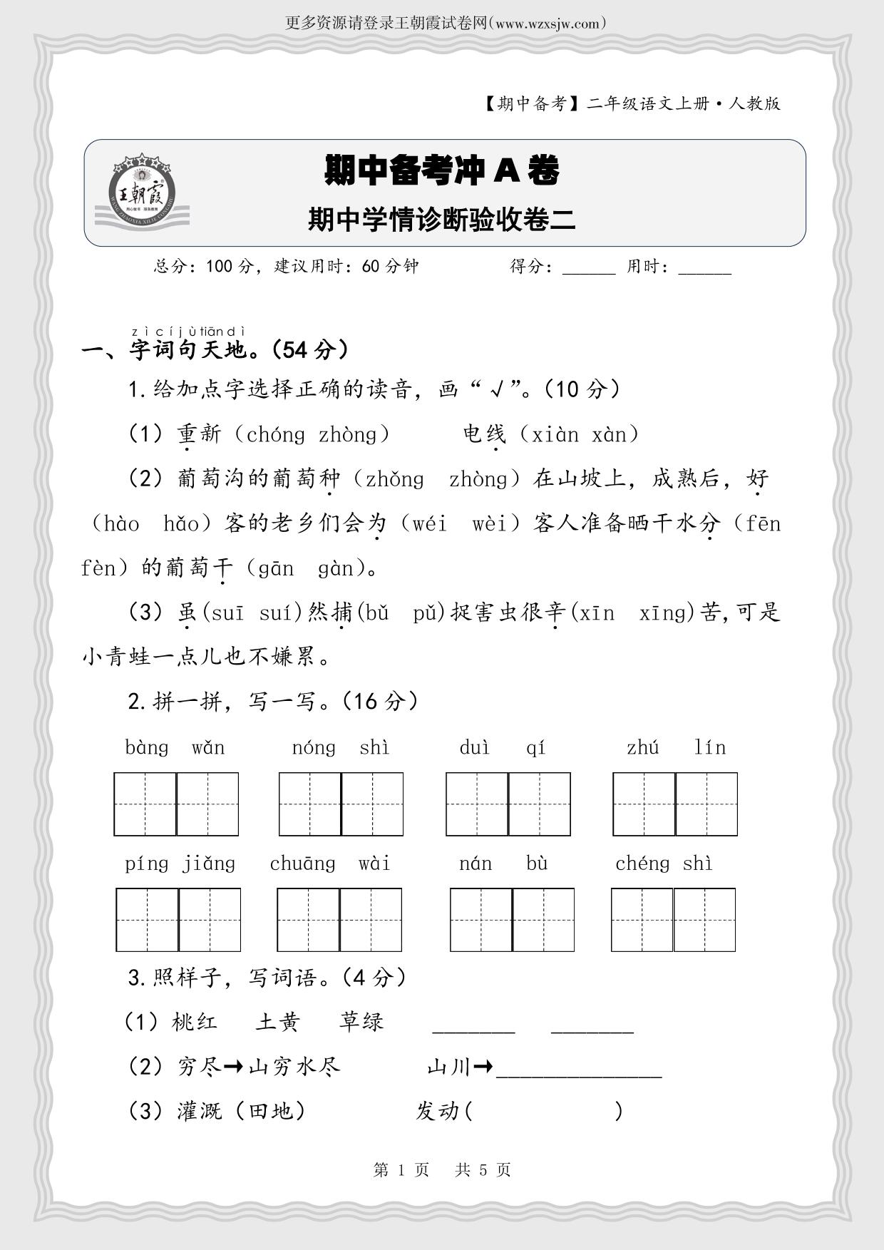 【期中备考】二年级语文上册人教版·期中学情诊断验收卷二