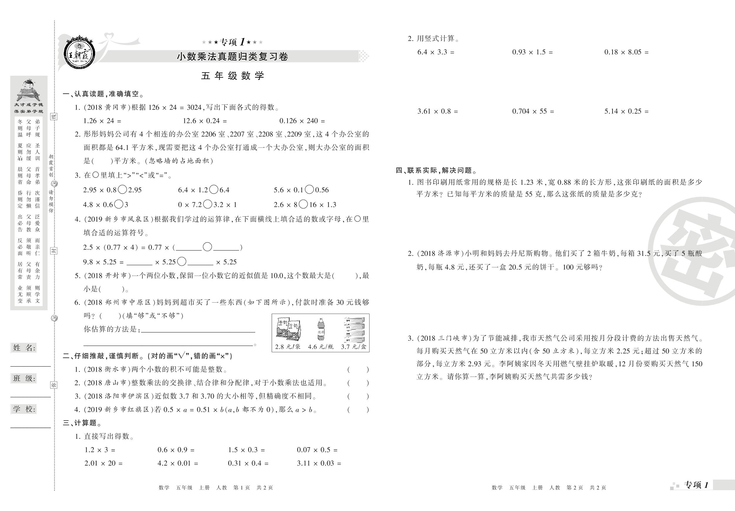 王朝霞期末专项卷——小数乘法、小数除法真题归类复习五年级上册数学(人教版)_R210804172857【0】