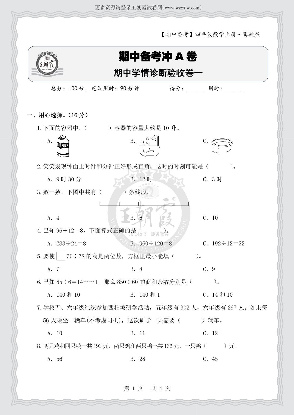 【期中备考】四年级数学上册冀教版·期中学情诊断验收卷一