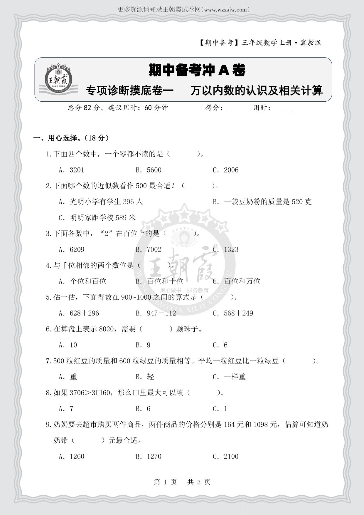 【期中备考】三年级数学上册冀教版·专项诊断摸底卷一 万以内数的认识及相关计算