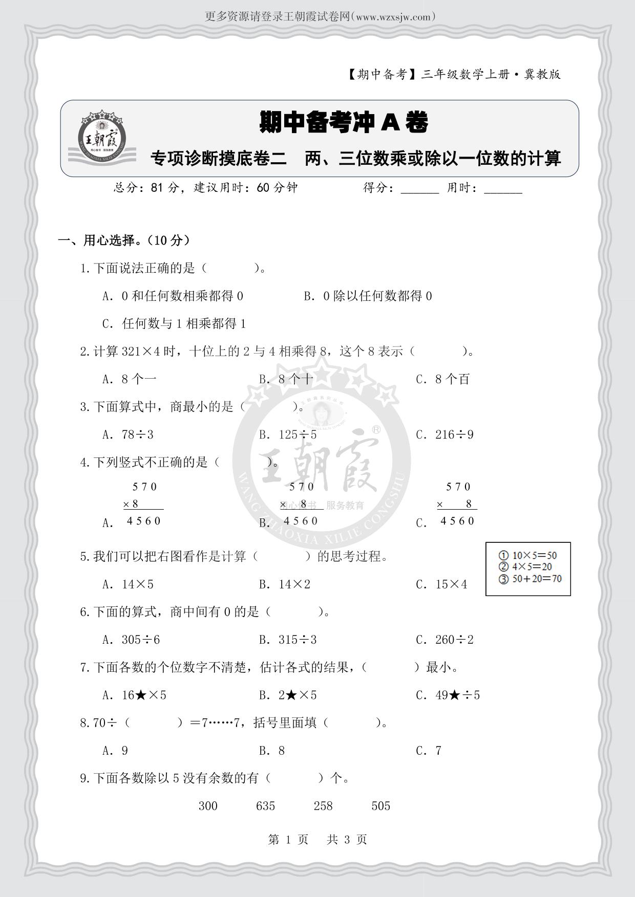 【期中备考】三年级数学上册冀教版·专项诊断摸底卷二 两、三位数乘或除以一位数的计算
