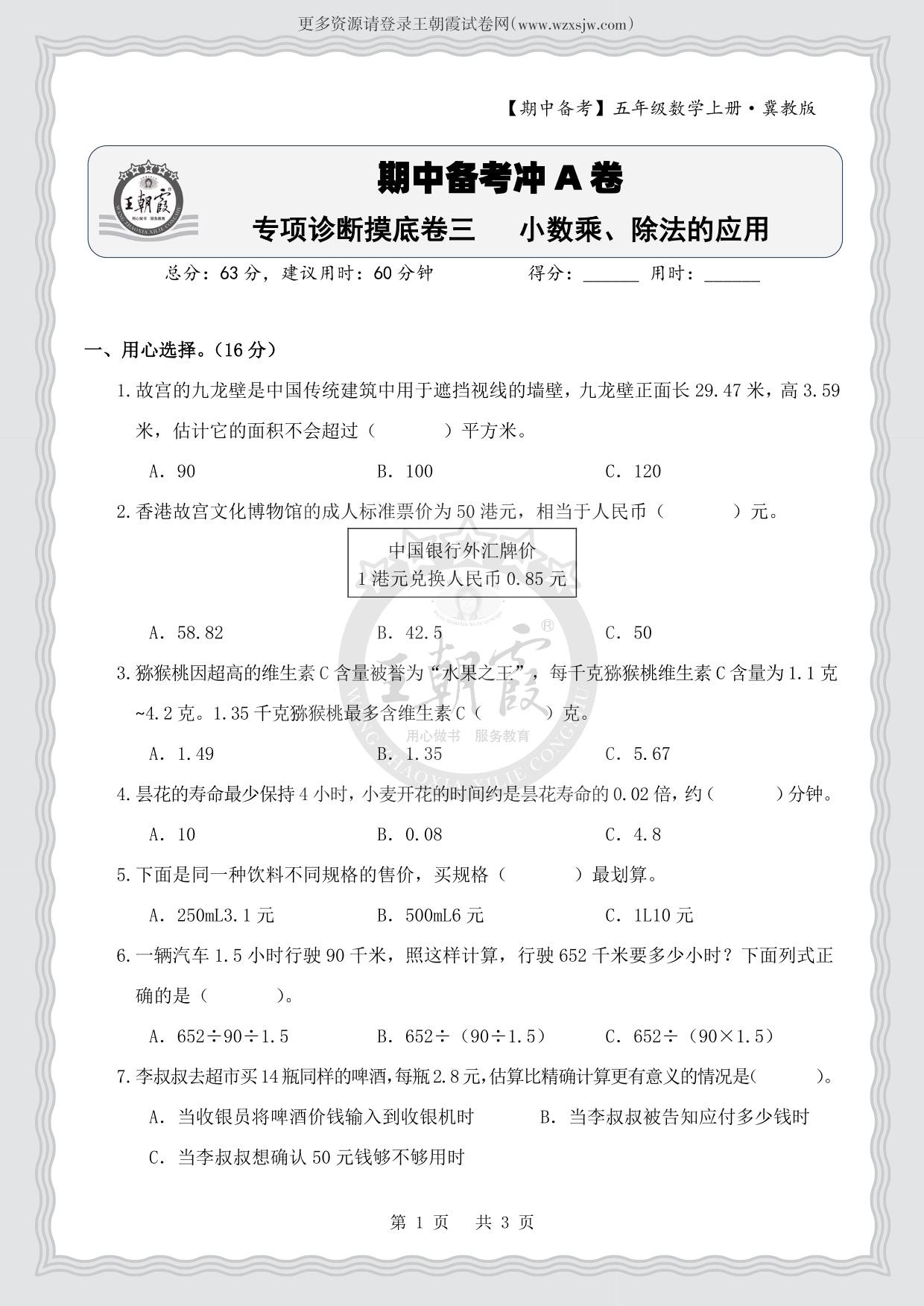 【期中备考】五年级数学上册冀教版·专项诊断摸底卷三 小数乘、除法的应用 _R241017144748320