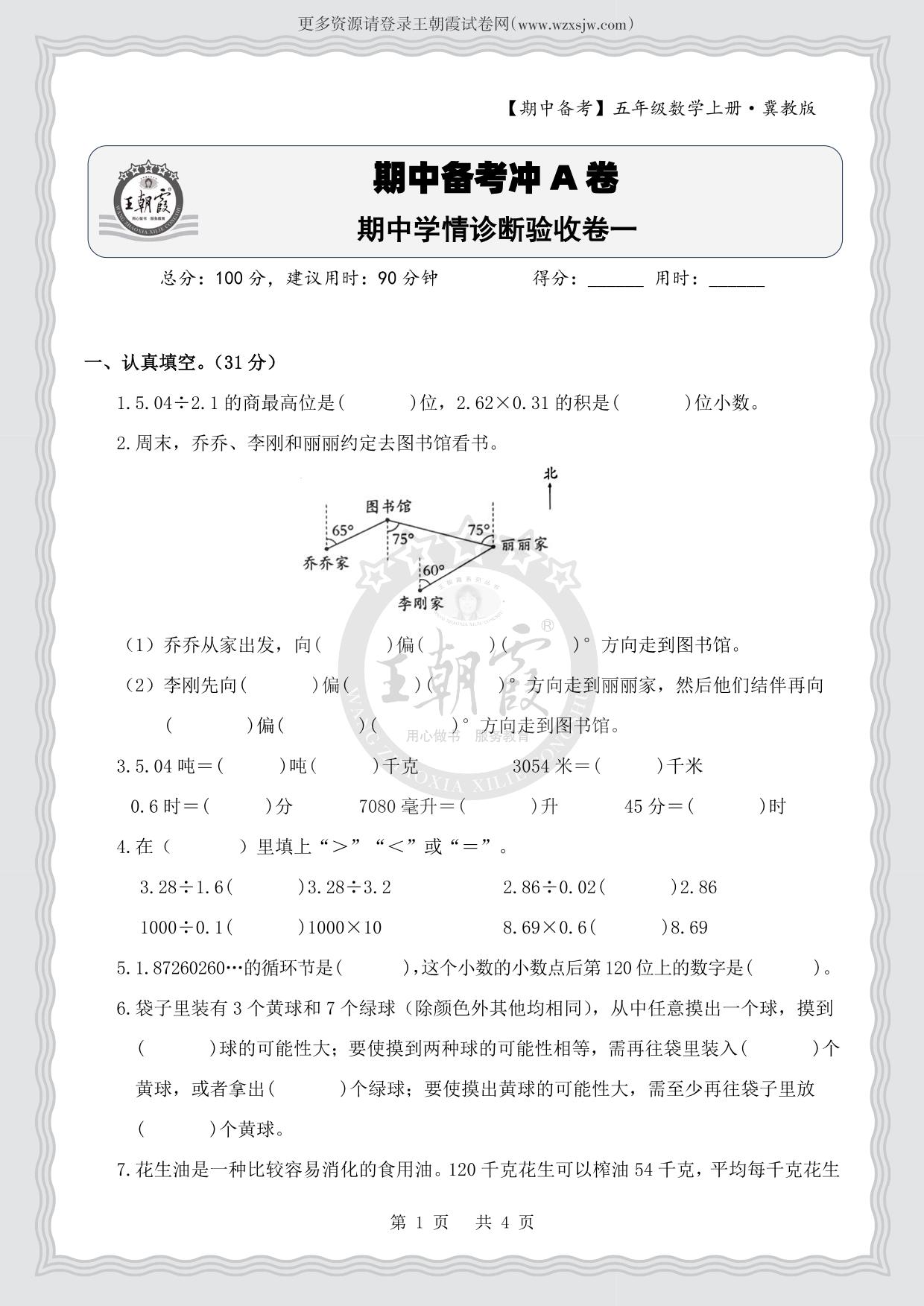 【期中备考】五年级数学上册冀教版·期中学情诊断验收卷一 _R241017144749191