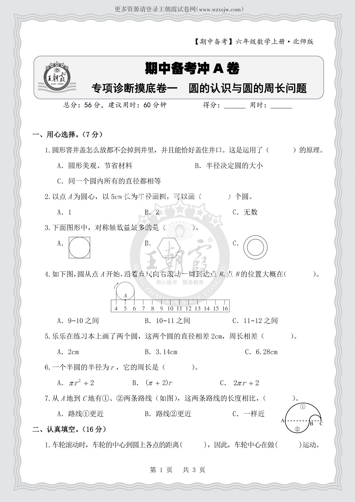 【期中备考】六年级数学上册北师版·专项诊断摸底卷一 圆的认识与圆的周长问题