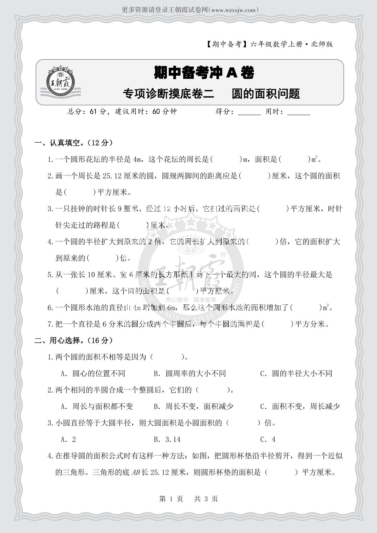 【期中备考】六年级数学上册北师版·专项诊断摸底卷二 圆的面积问题