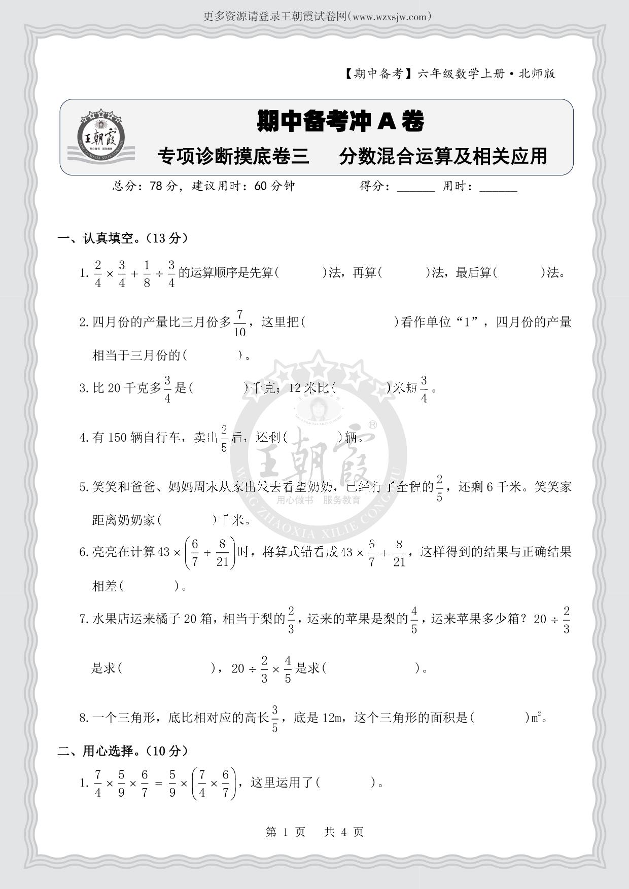 【期中备考】六年级数学上册北师版·专项诊断摸底卷三 分数混合运算及相关应用