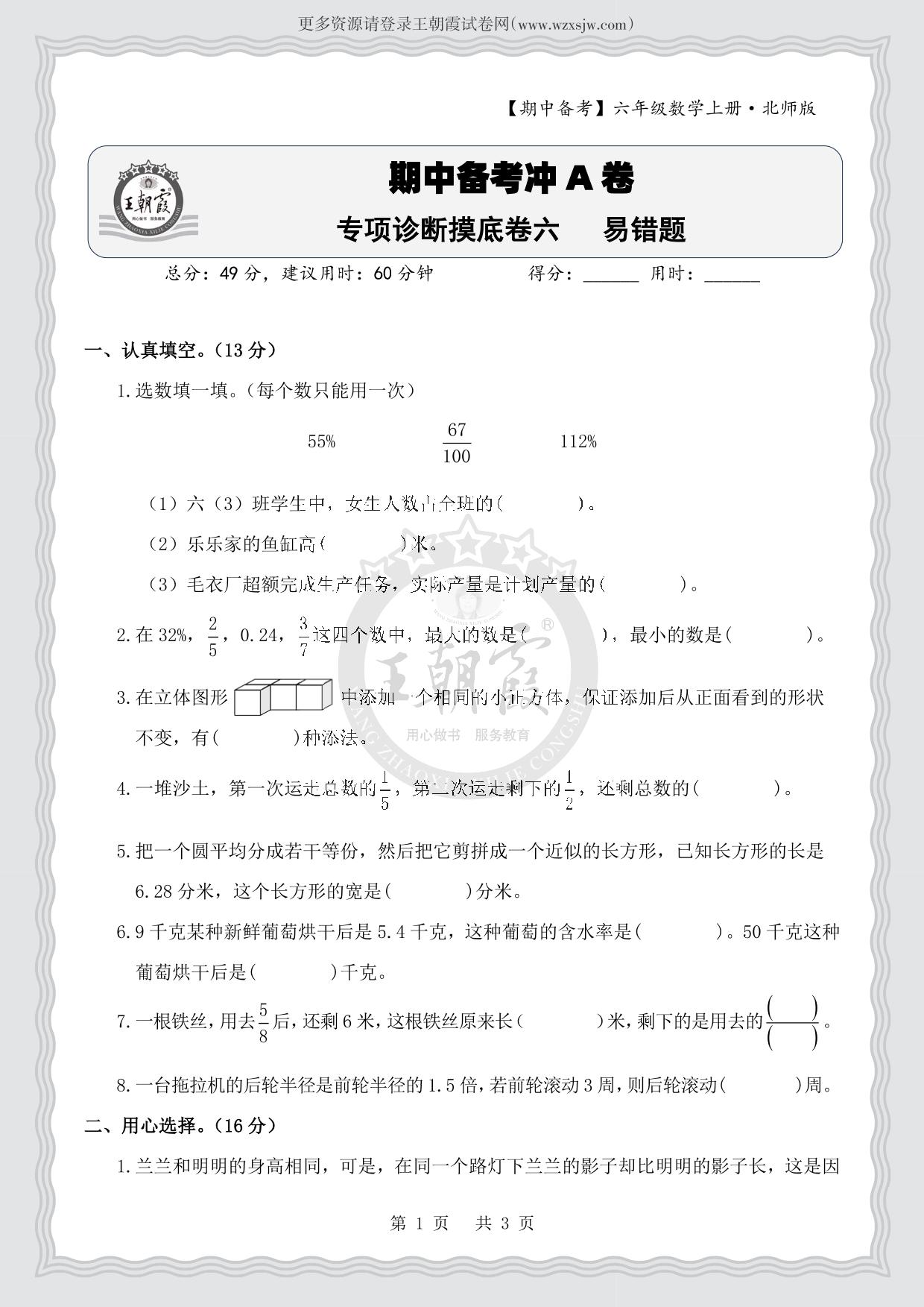 六年级数学北师版上册专项卷
