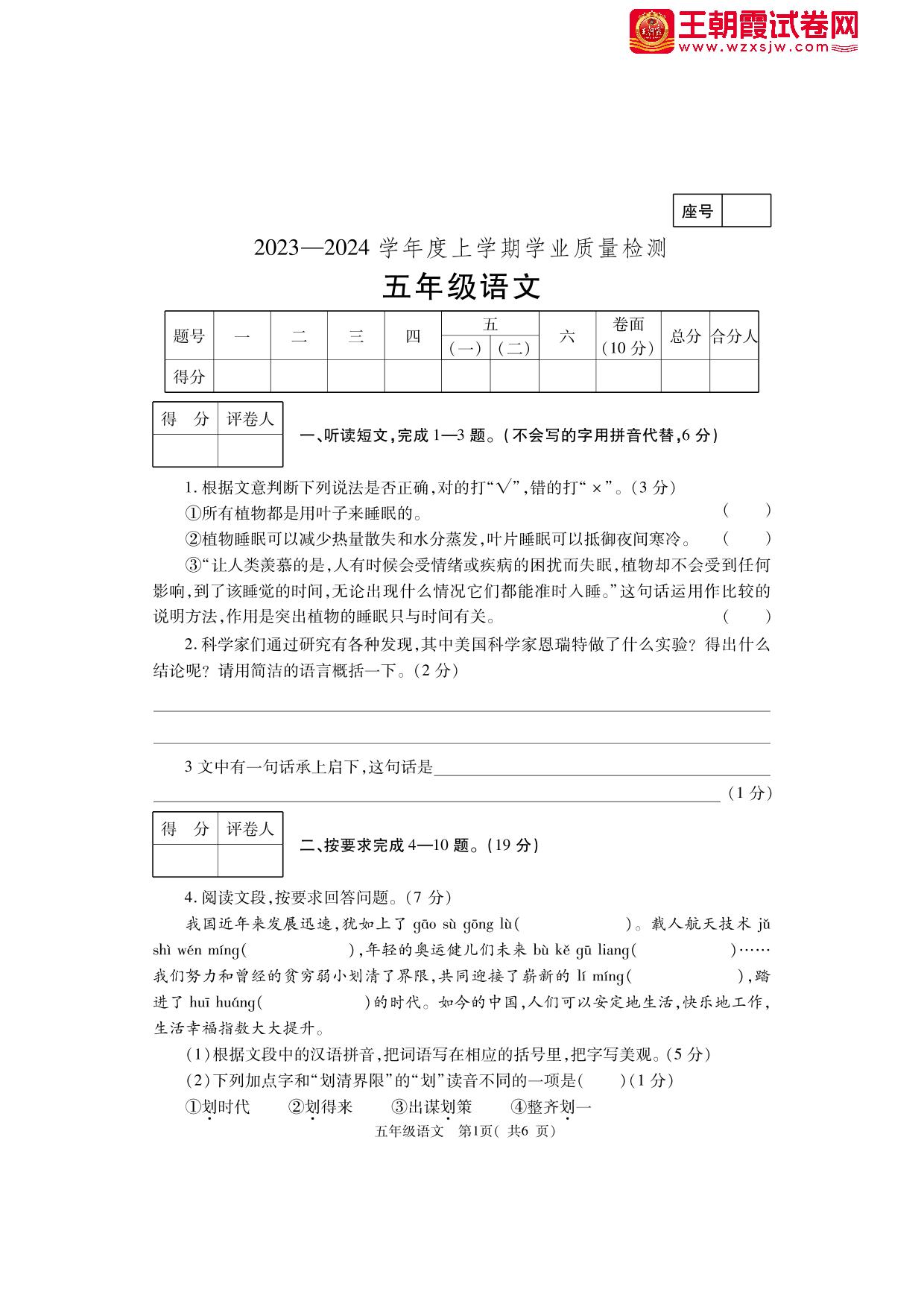 河南省郑州市巩义市2023-2024学年度上学期期末学业质量检测五年级语文(人教版)【无听力音频】