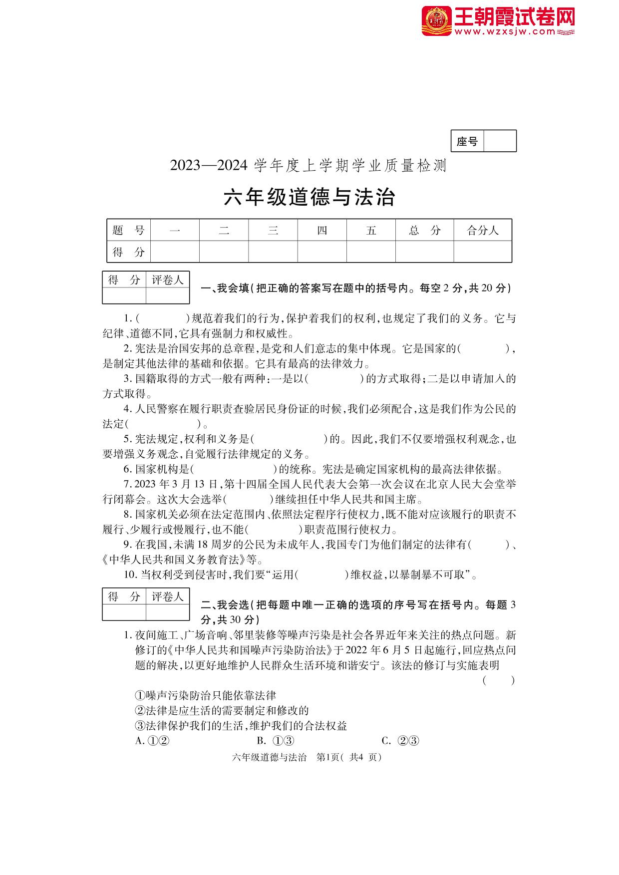 河南省郑州市巩义市2023-2024学年度上学期期末学业质量检测六年级道德与法治(人教版)