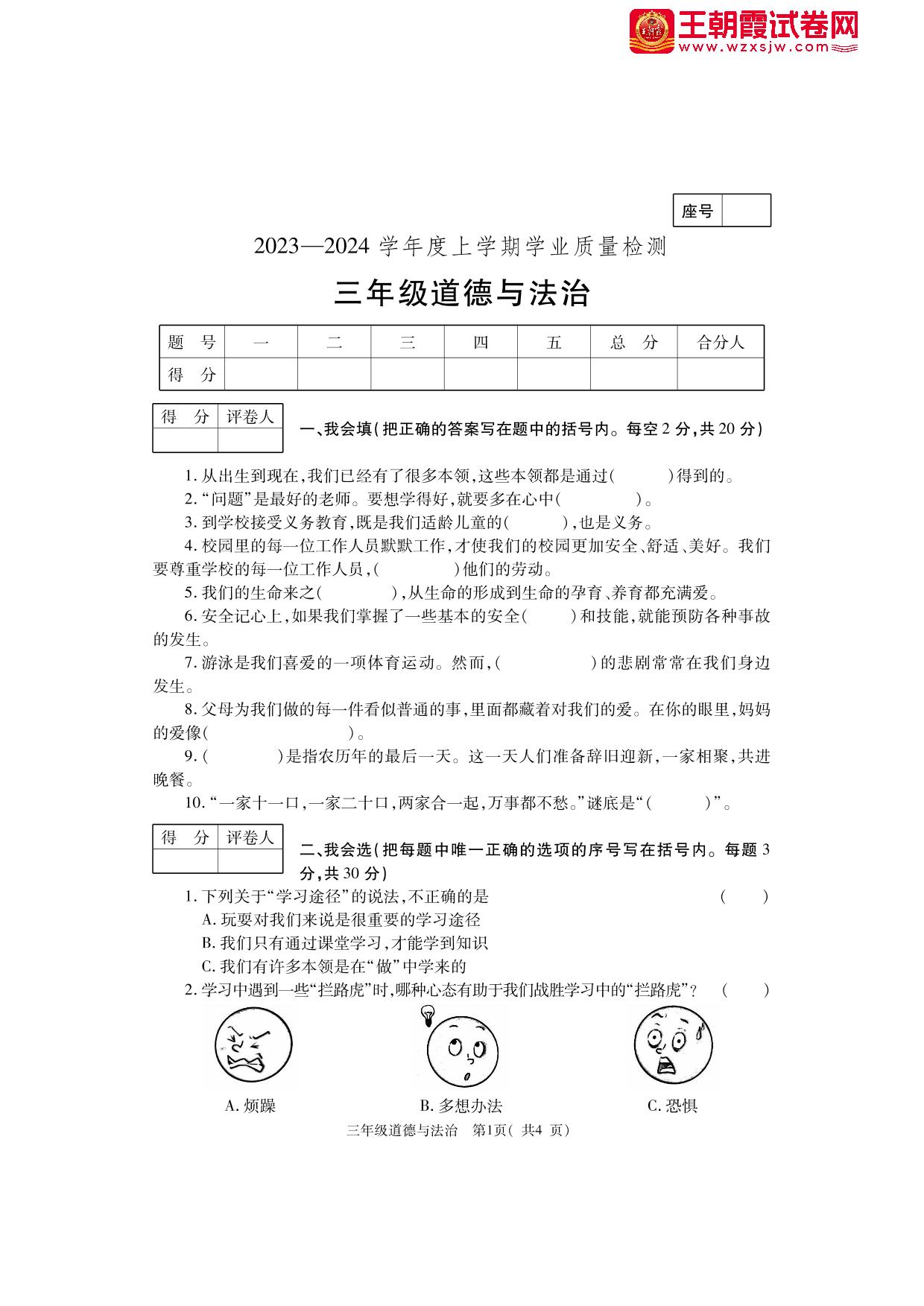 河南省郑州市巩义市2023-2024学年度上学期期末学业质量检测三年级道德与法治(人教版)