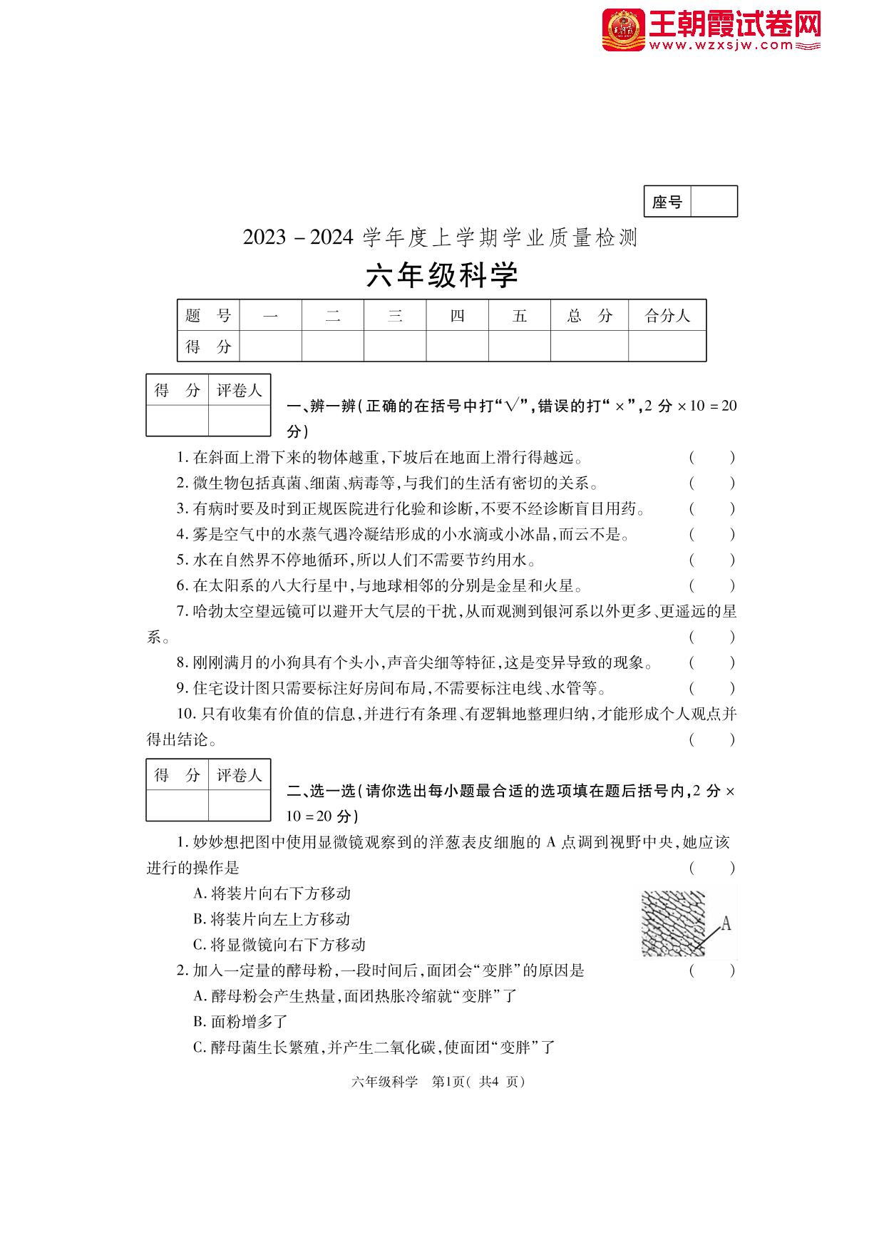 河南省郑州市巩义市2023-2024学年度上学期期末学业质量检测六年级科学(大象版)