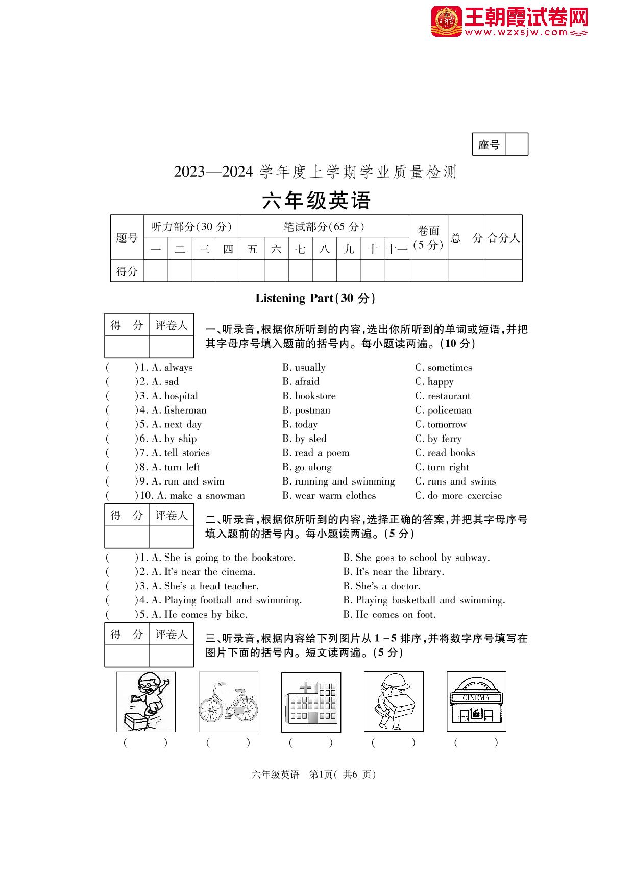 河南省郑州市巩义市2023-2024学年度上学期期末学业质量检测六年级英语(人教PEP版)【无听力音频】