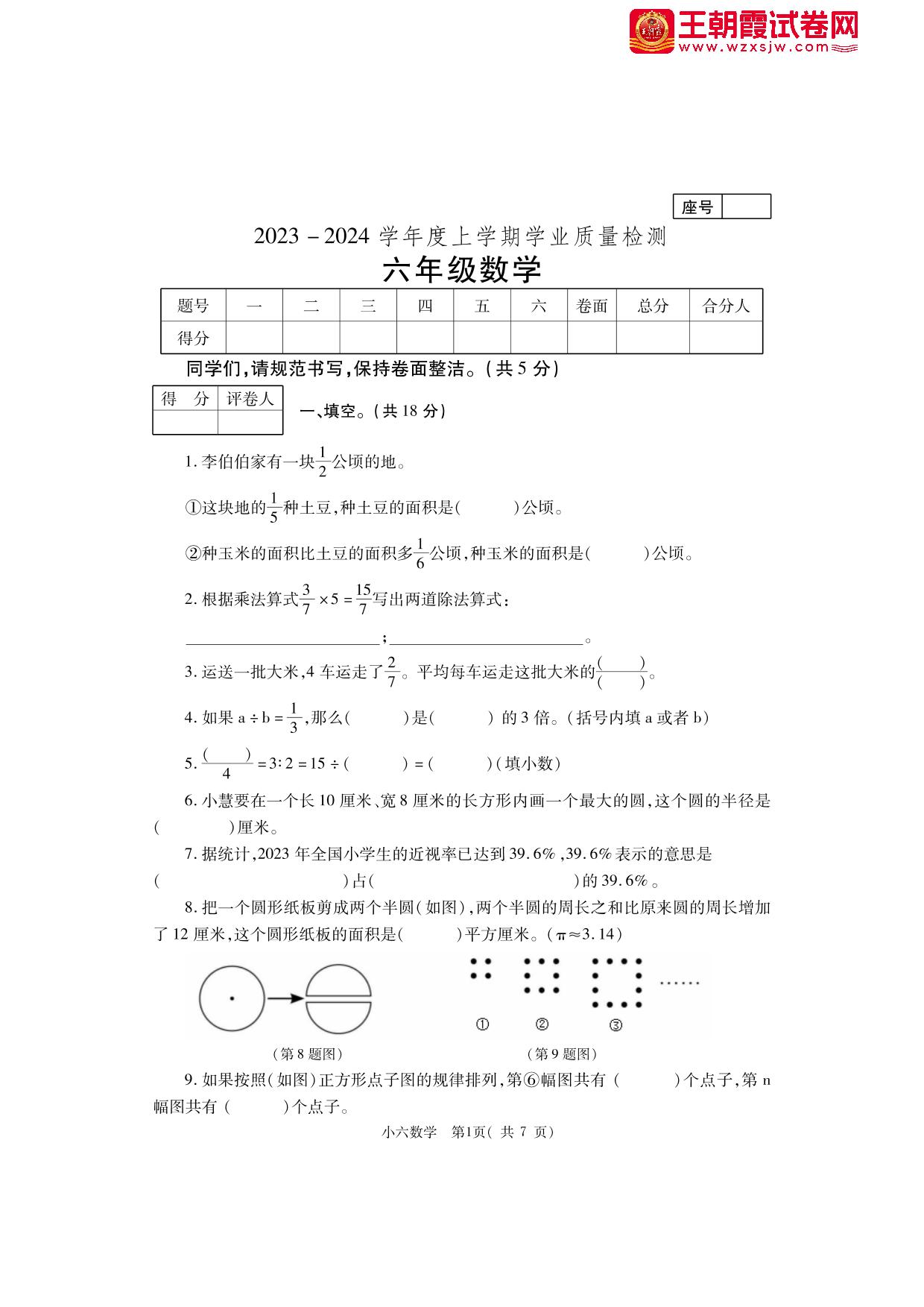 河南省郑州市巩义市2023-2024学年度上学期期末学业质量检测六年级数学(人教版)