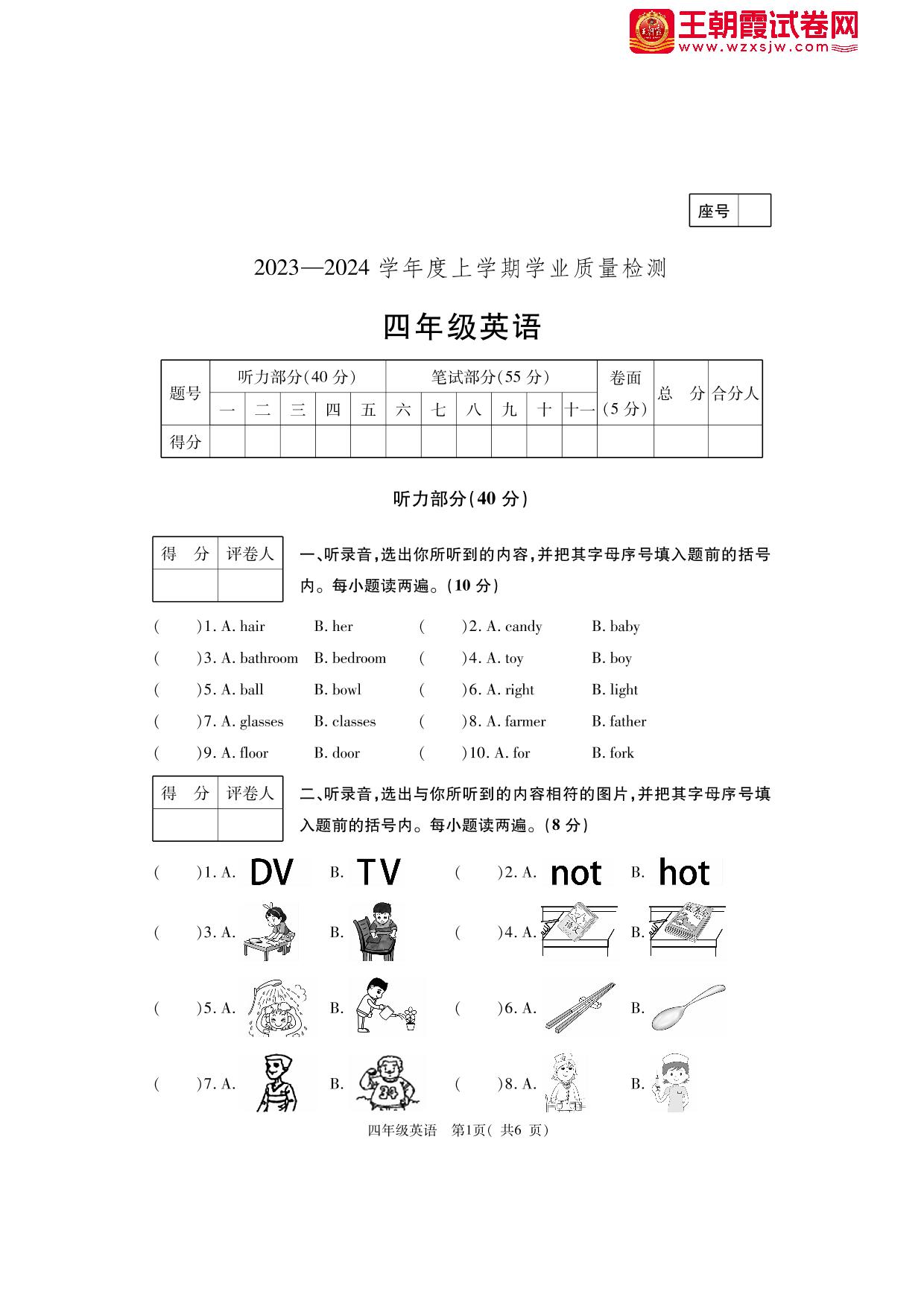 四年级英语人教PEP版(三起始)上册期末卷