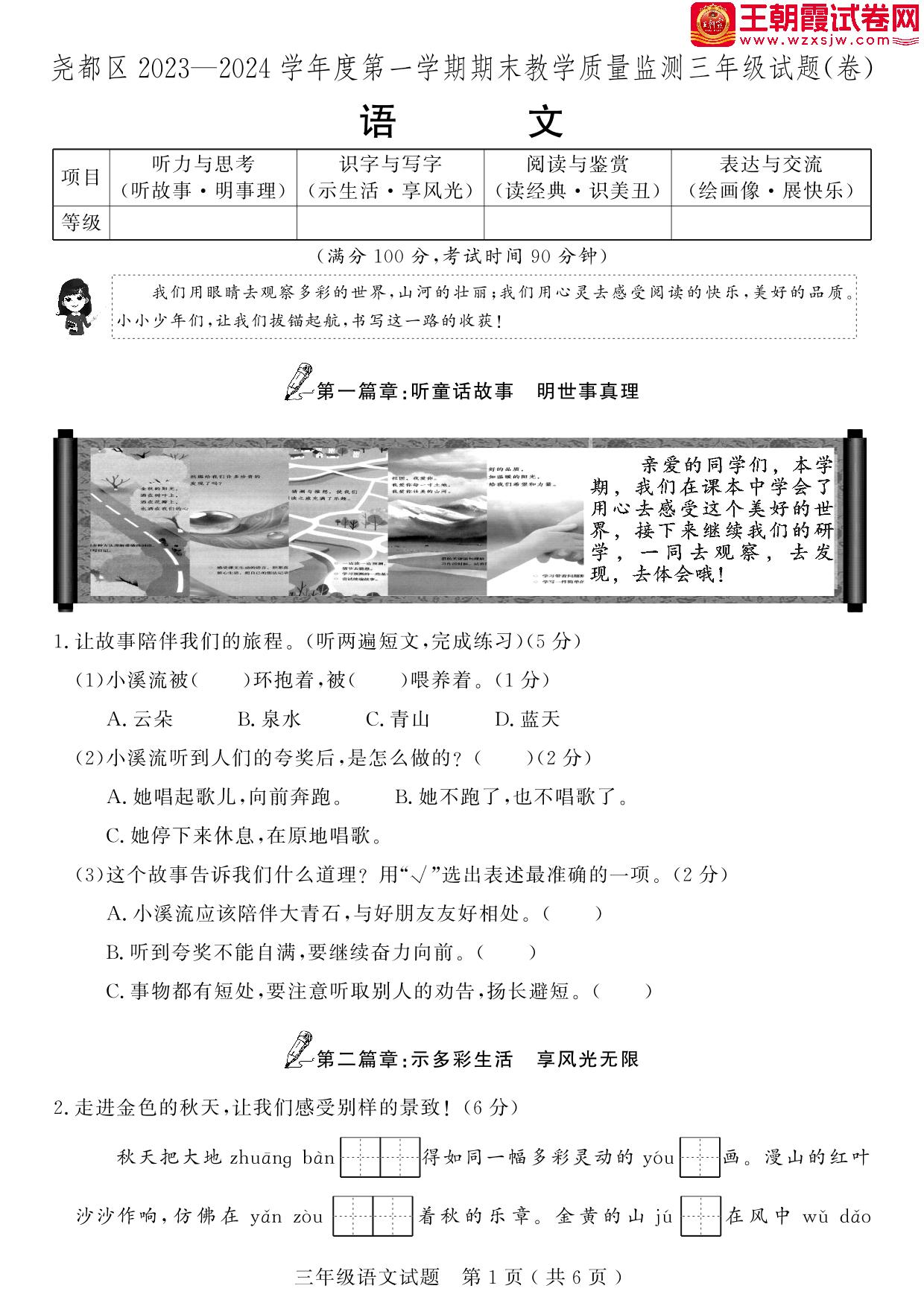山西省临汾市尧都区2023-2024学年度第一学期期末教学质量监测三年级语文(人教版)【无听力音频】