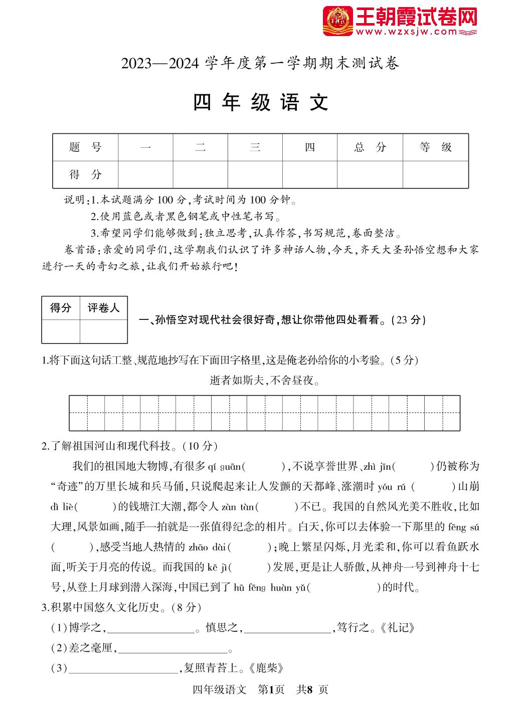 山西省临汾市侯马市2023-2024学年度第一学期期末测试卷四年级语文(人教版)