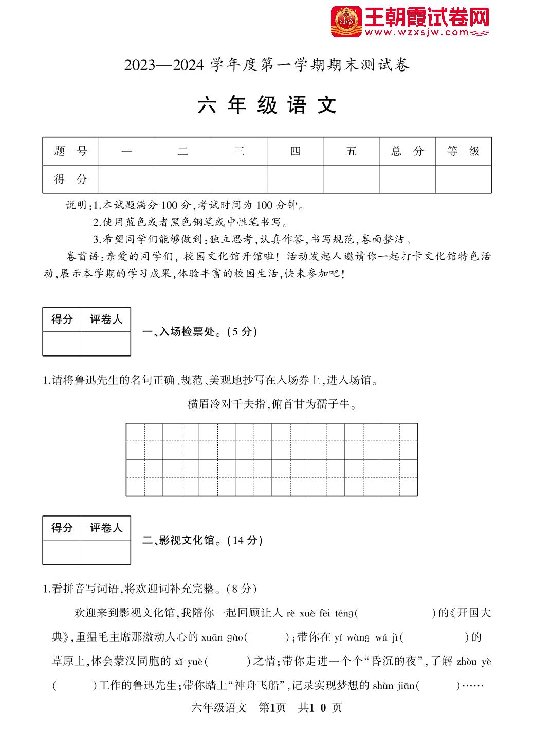 山西省临汾市侯马市2023-2024学年度第一学期期末测试卷六年级语文(人教版)