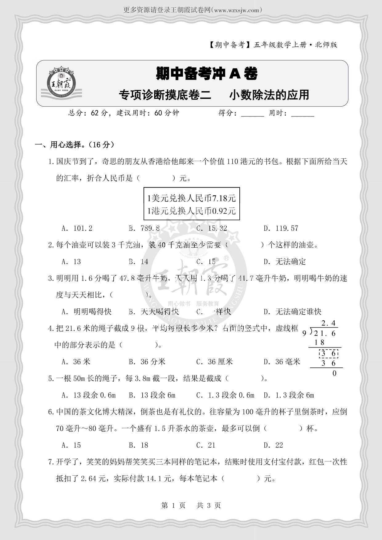 【期中备考】五年级数学上册北师版·专项诊断摸底卷二 小数除法的应用