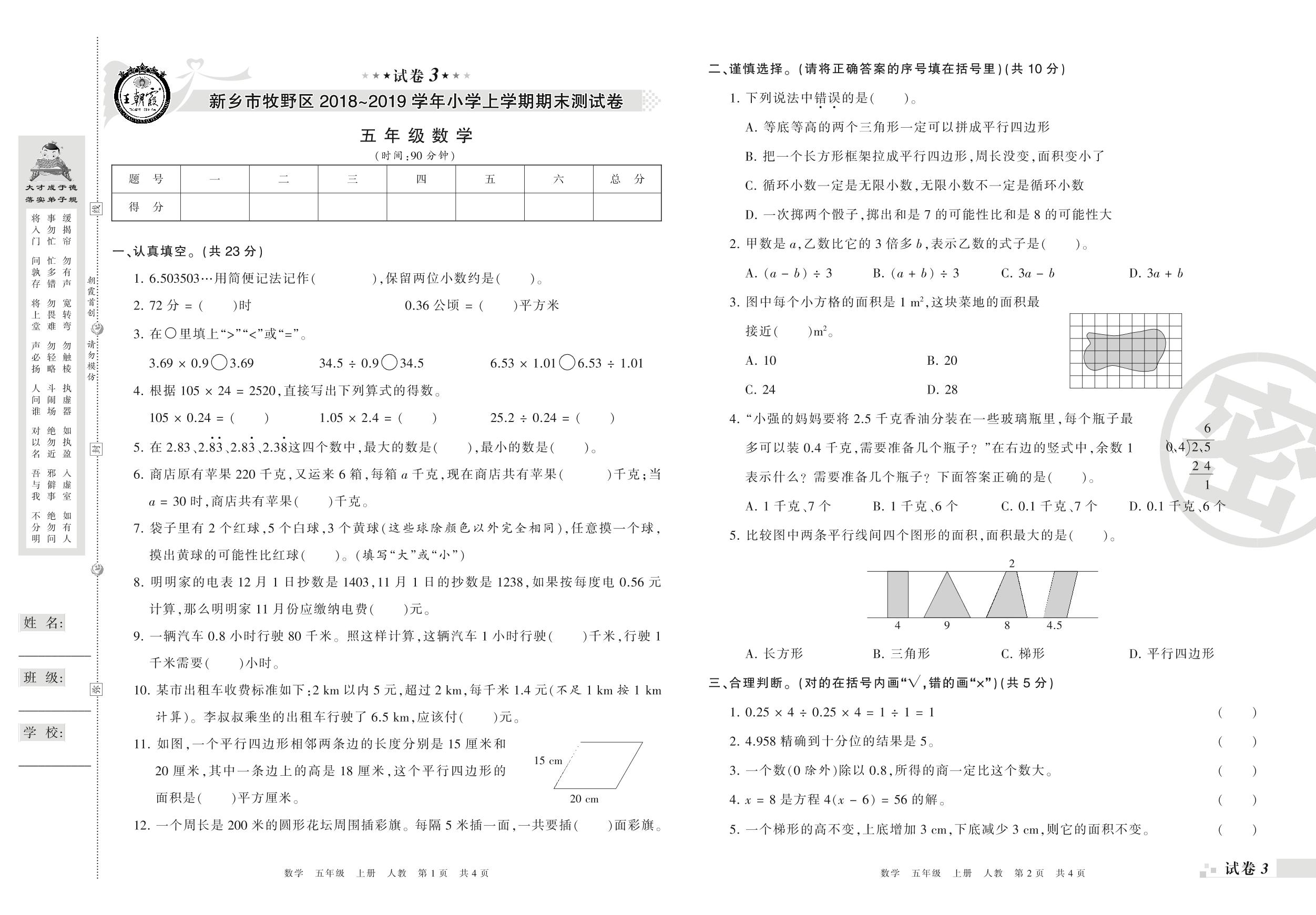 2018-2019学年第一学期新乡市牧野区五年级数学试卷(人教版)【3】