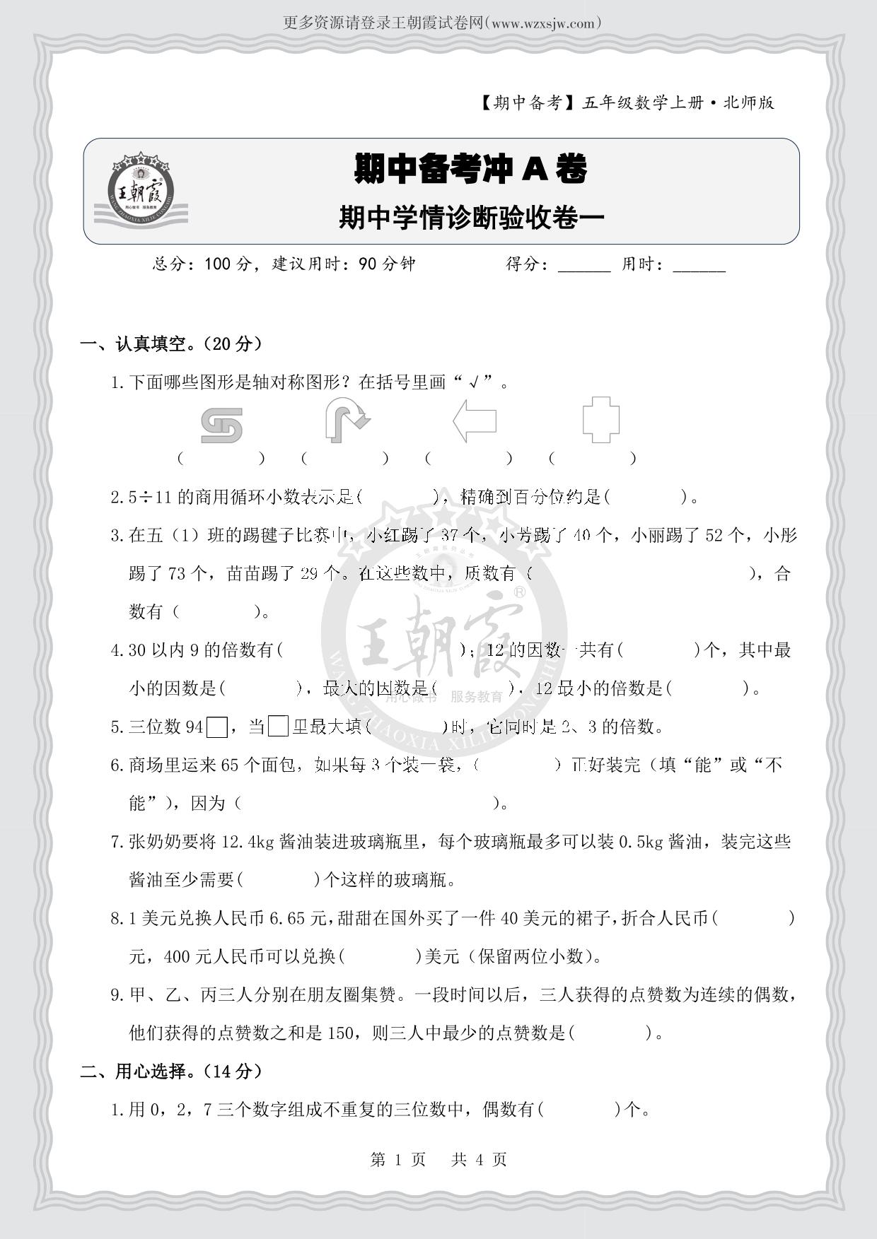 【期中备考】五年级数学上册北师版·期中学情诊断验收卷一