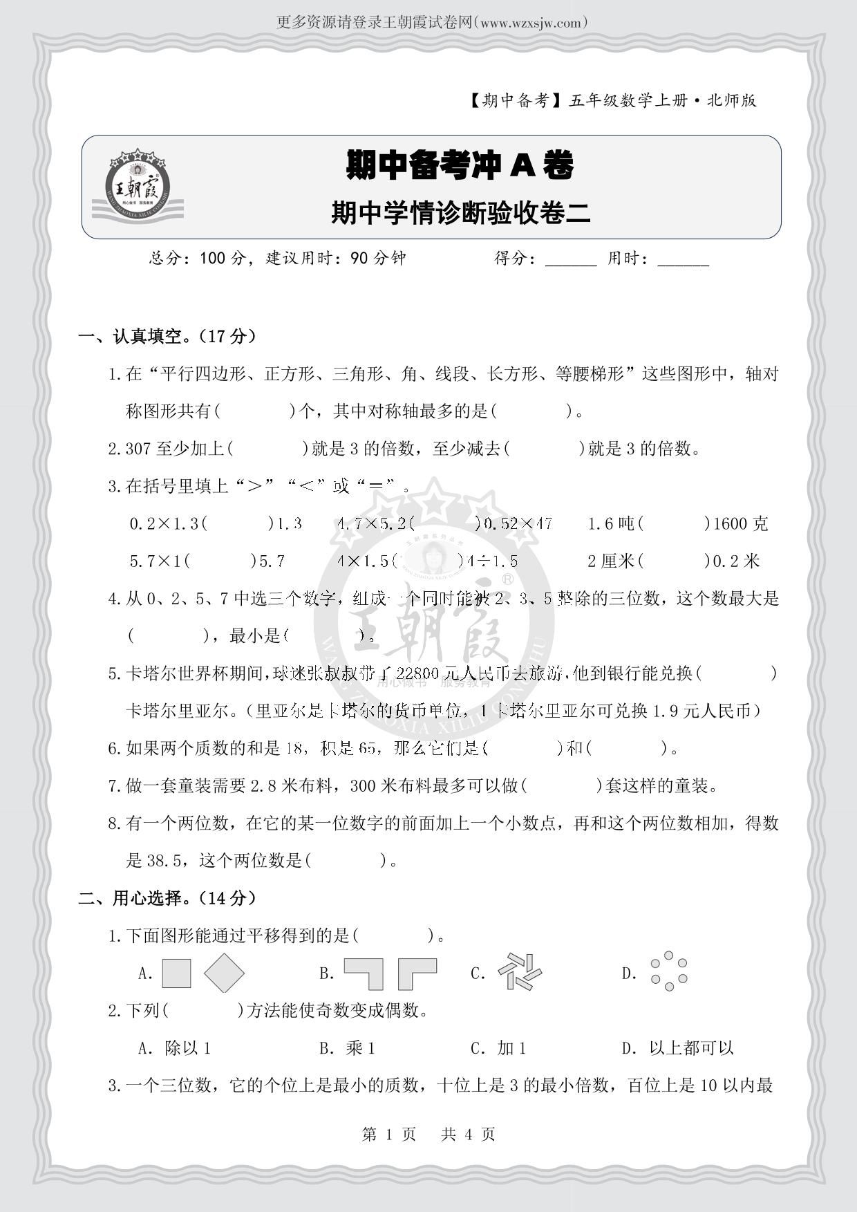五年级数学北师版上册期中卷