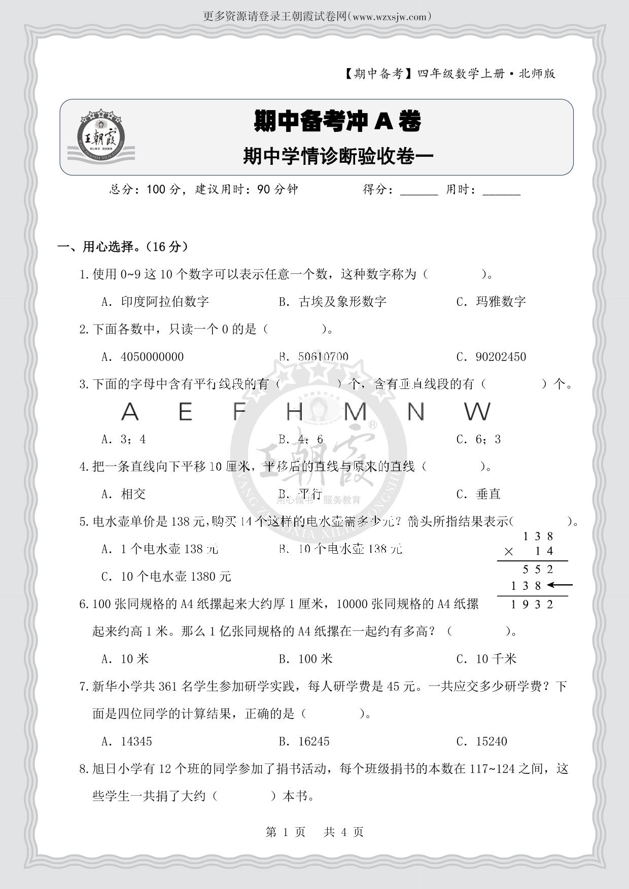 【期中备考】四年级数学上册北师版·期中学情诊断验收卷一