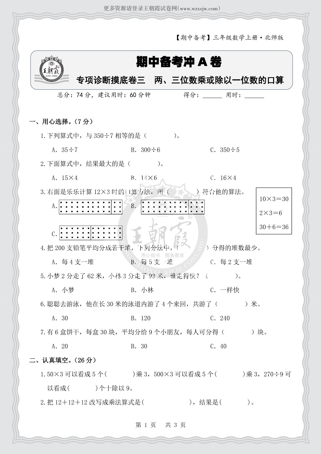 【期中备考】三年级数学上册北师版·专项诊断摸底卷三 两、三位数乘或除以一位数的口算