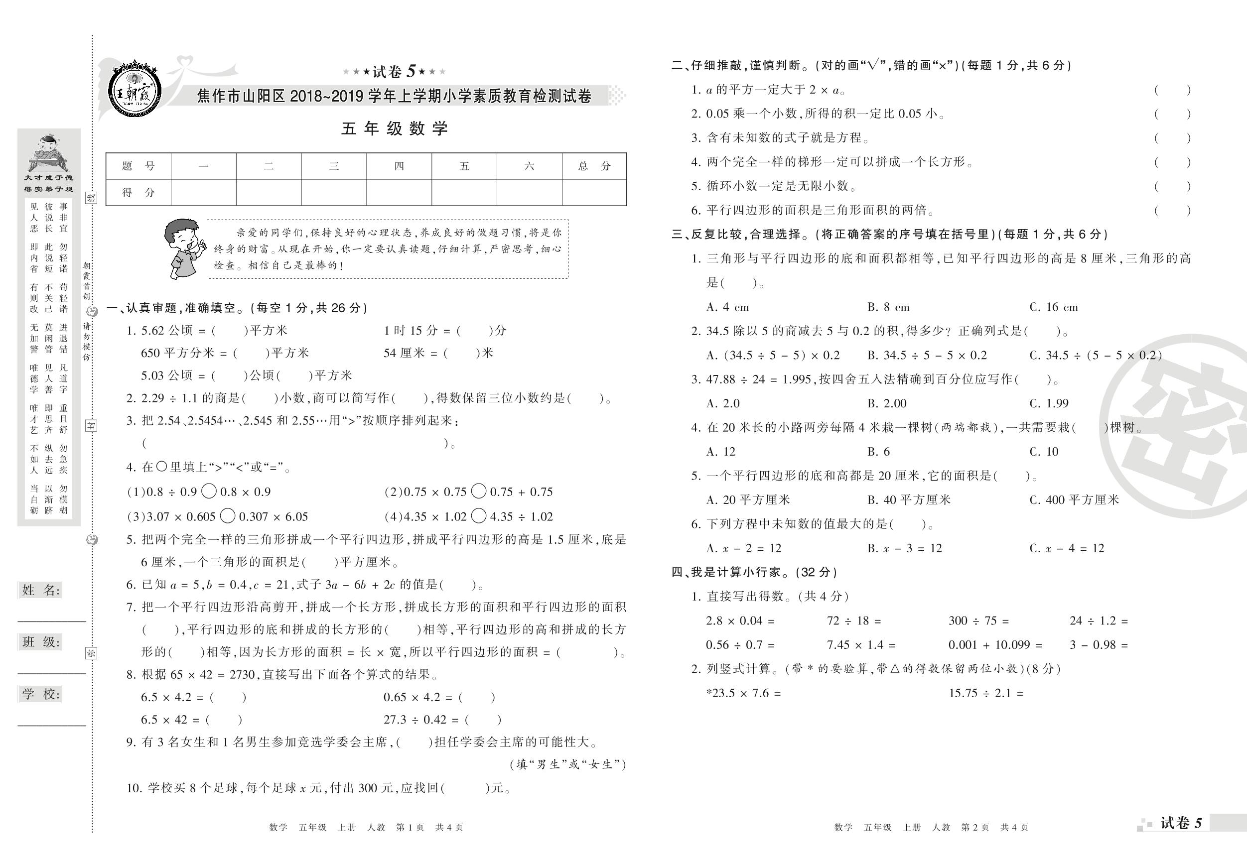 2018-2019学年第一学期焦作市山阳区五年级数学试卷(人教版)【5】