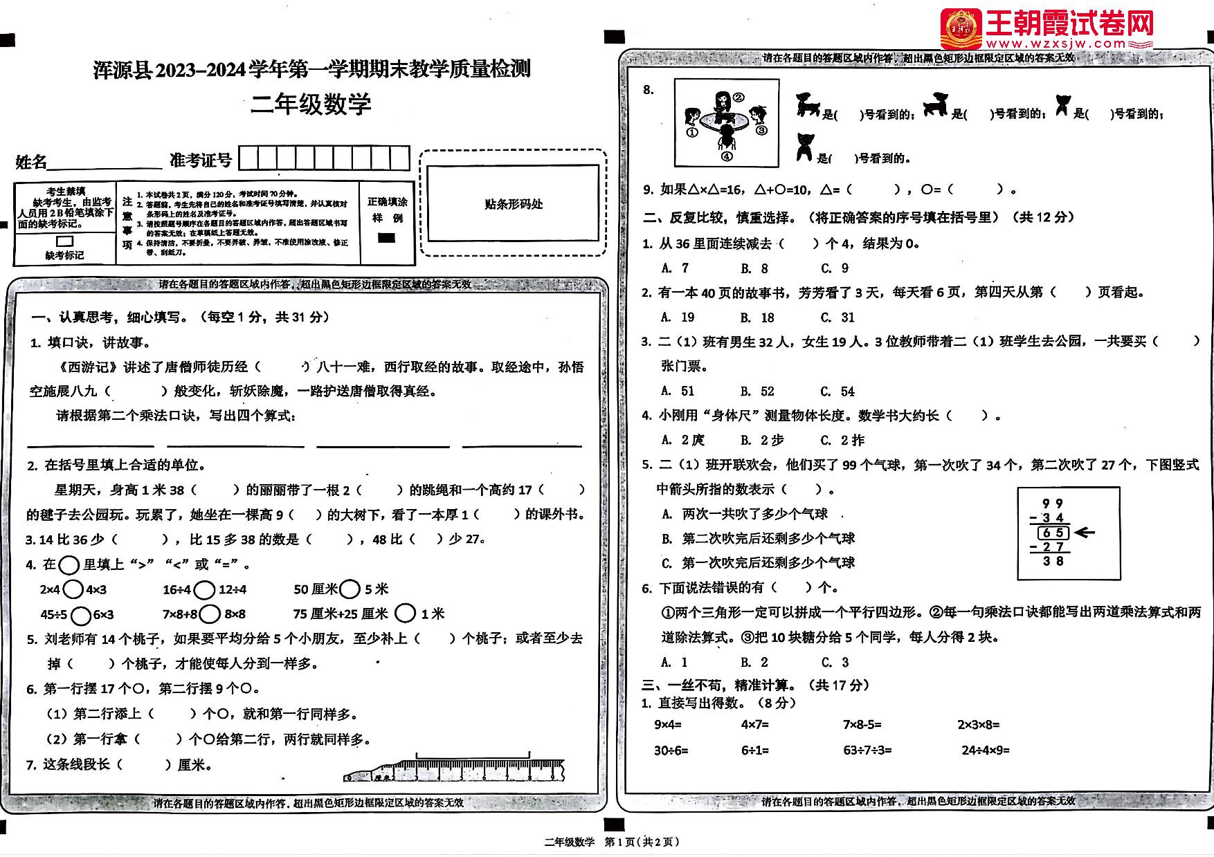 山西省大同市浑源县2023-2024学年第一学期期末教学质量检测二年级数学(苏教版)