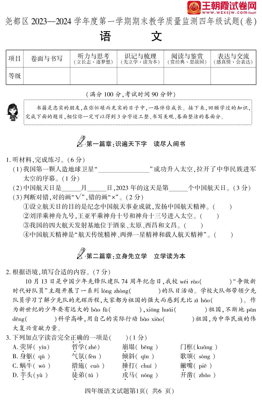 山西省临汾市尧都区2023-2024学年度第一学期期末教学质量监测四年级语文(人教版)【无听力音频】