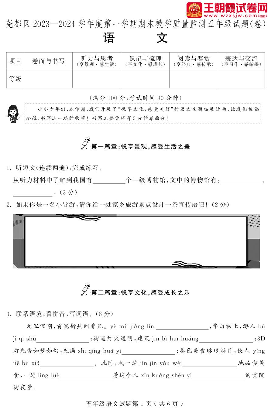 山西省临汾市尧都区2023-2024学年度第一学期期末教学质量监测五年级语文(人教版)【无听力音频】