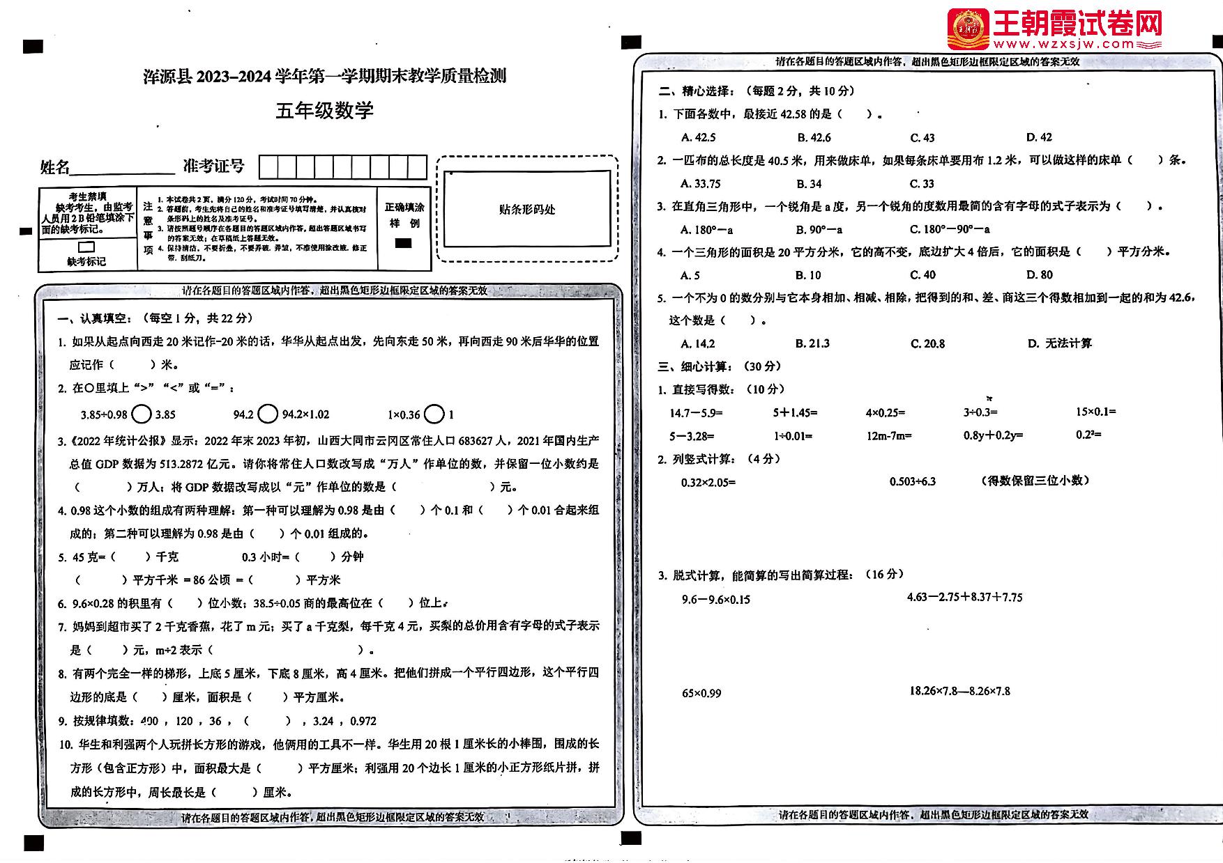 山西省大同市浑源县2023-2024学年第一学期期末教学质量检测五年级数学(苏教版)