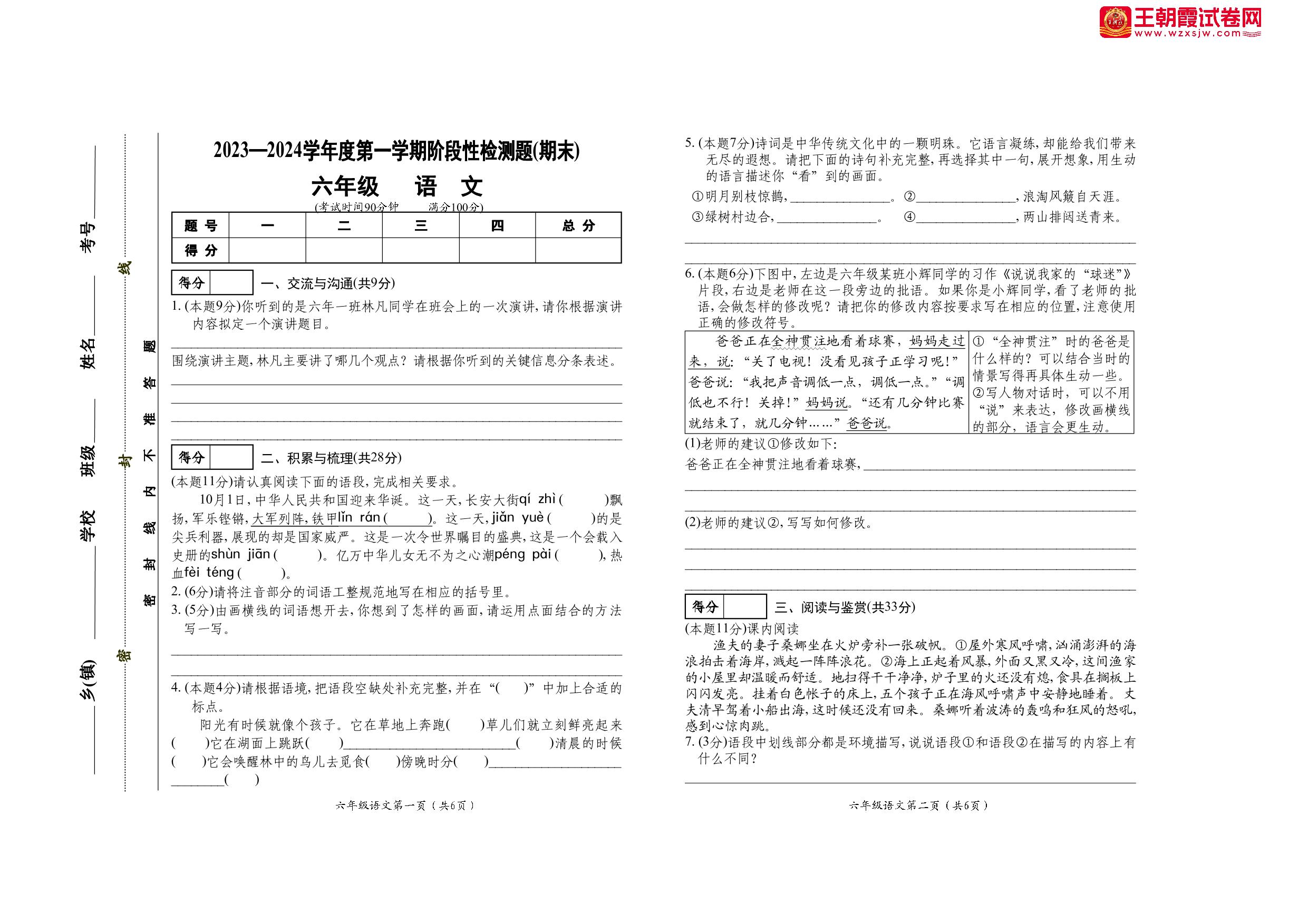 山西省晋中市祁县2023-2024学年度第一学期阶段性检测题(期末)六年级语文(人教版)【无听力音频】