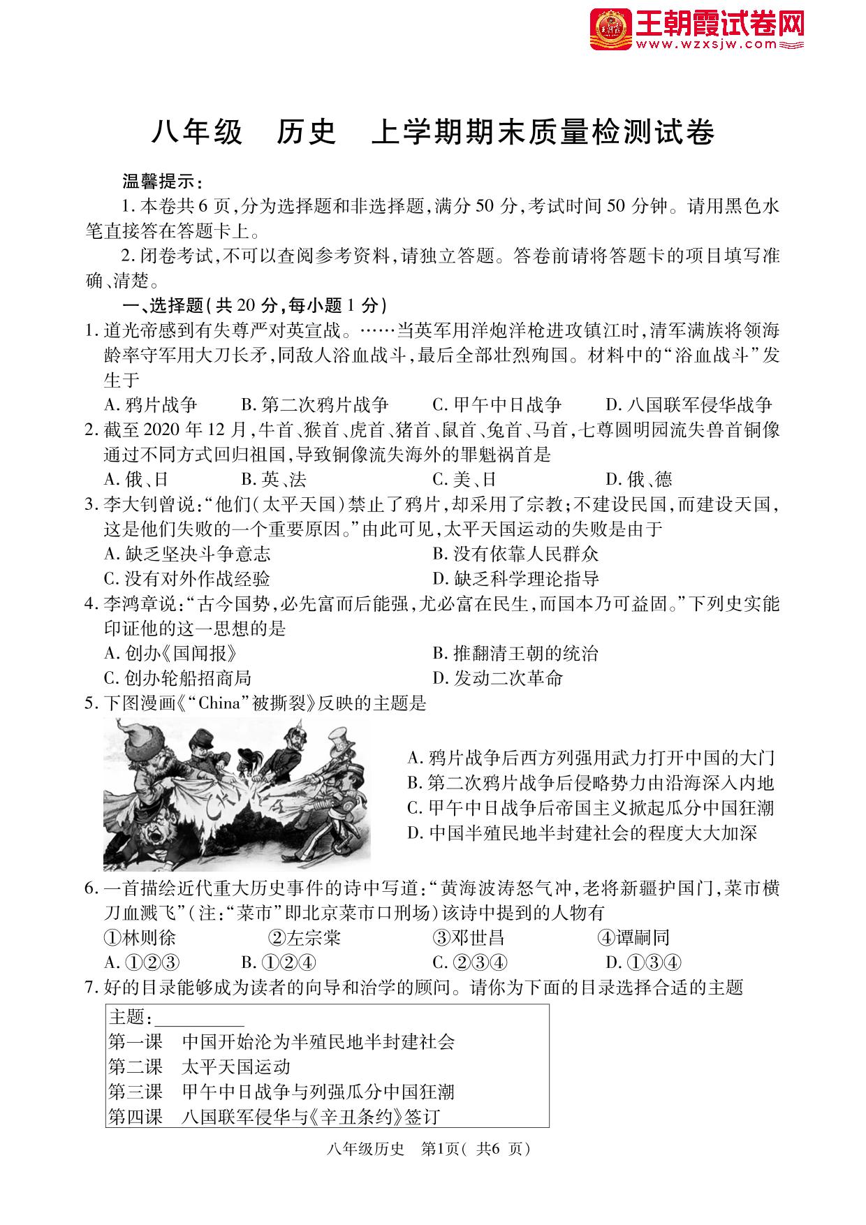 河南省郑州市巩义市2023-2024学年上学期期末质量检测试卷八年级历史(人教版)