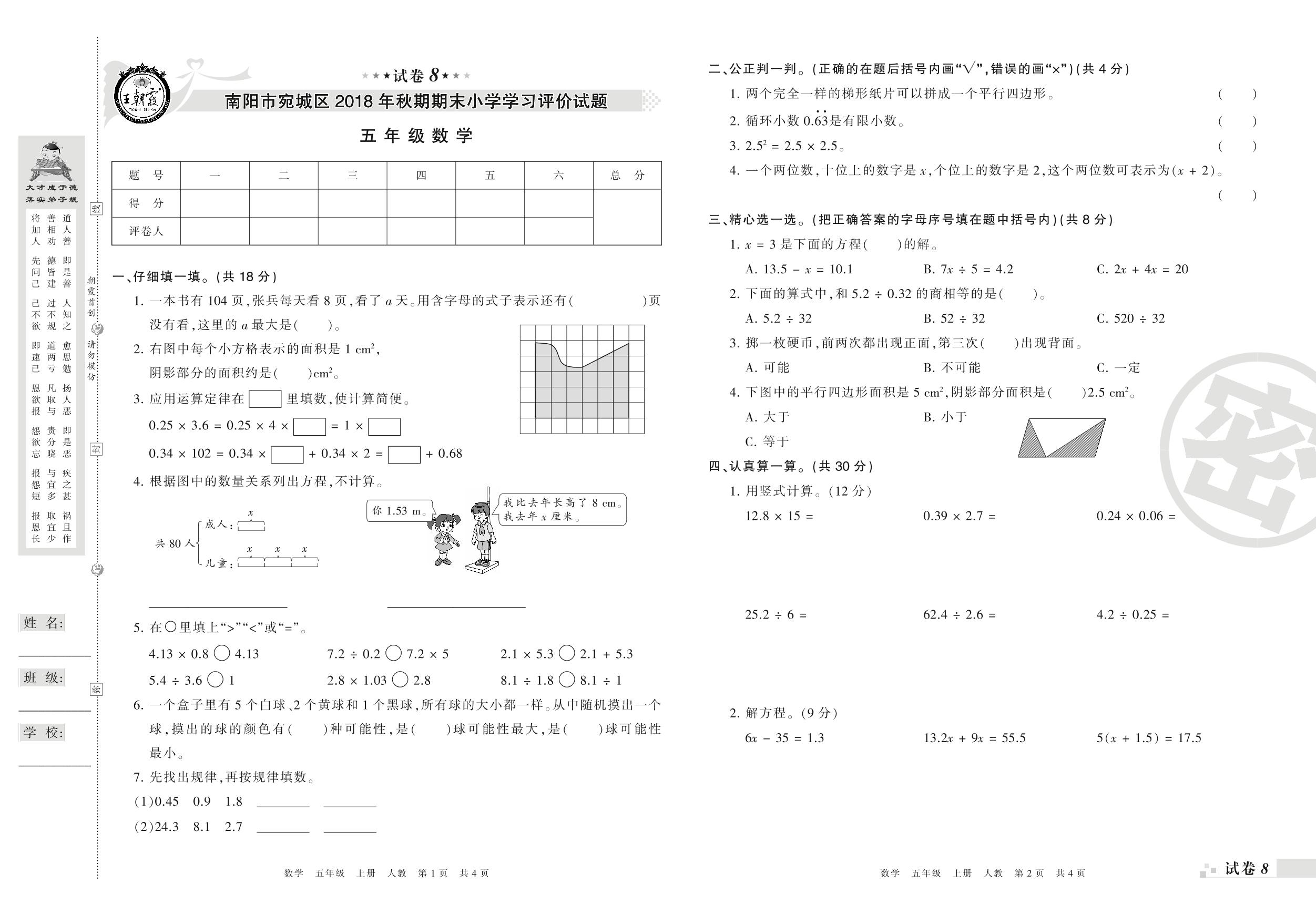 2018-2019学年第一学期南阳市宛城区五年级数学试卷(人教版)【8】
