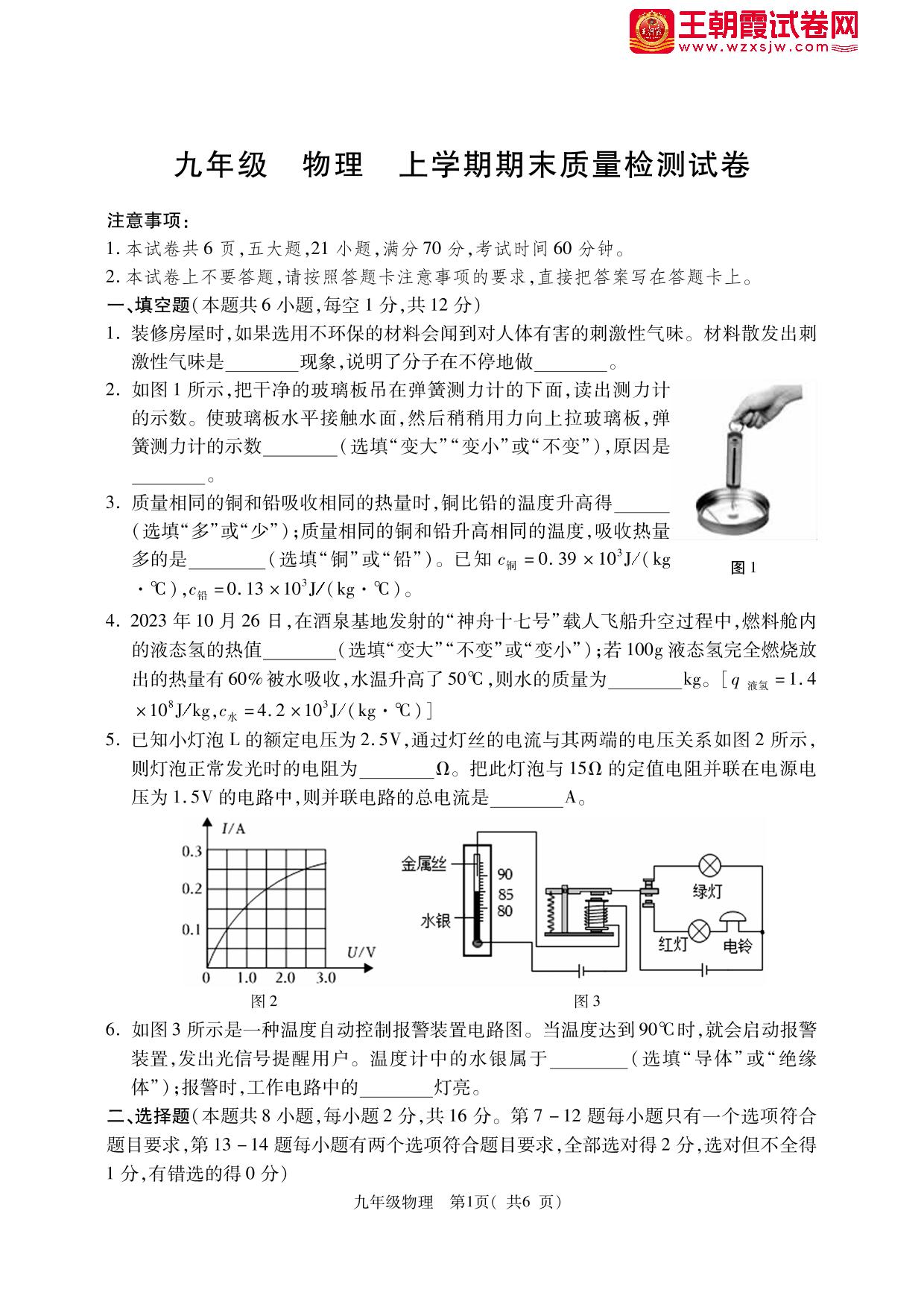 河南省郑州市巩义市2023-2024学年上学期期末质量检测试卷九年级物理(人教版)