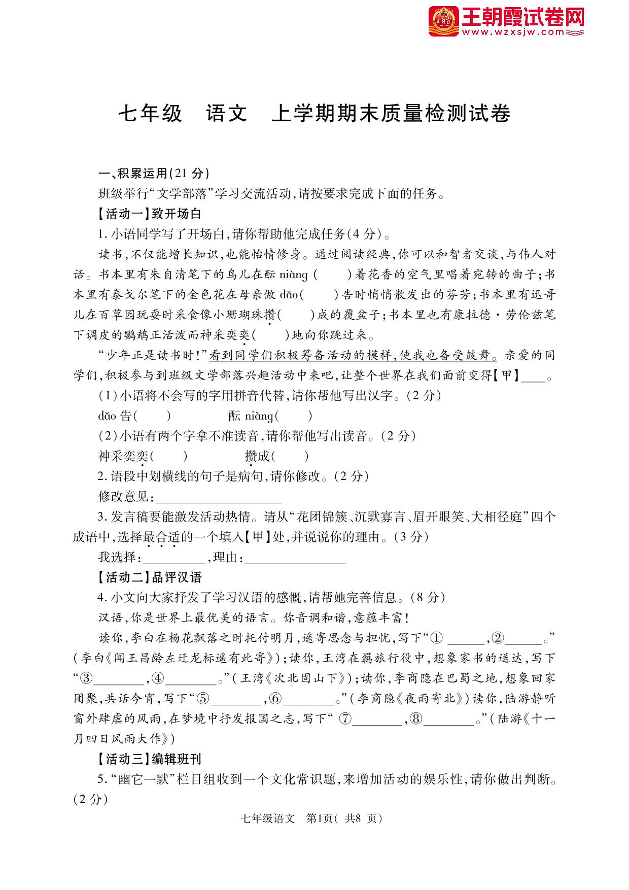 七年级语文人教版上册期末卷