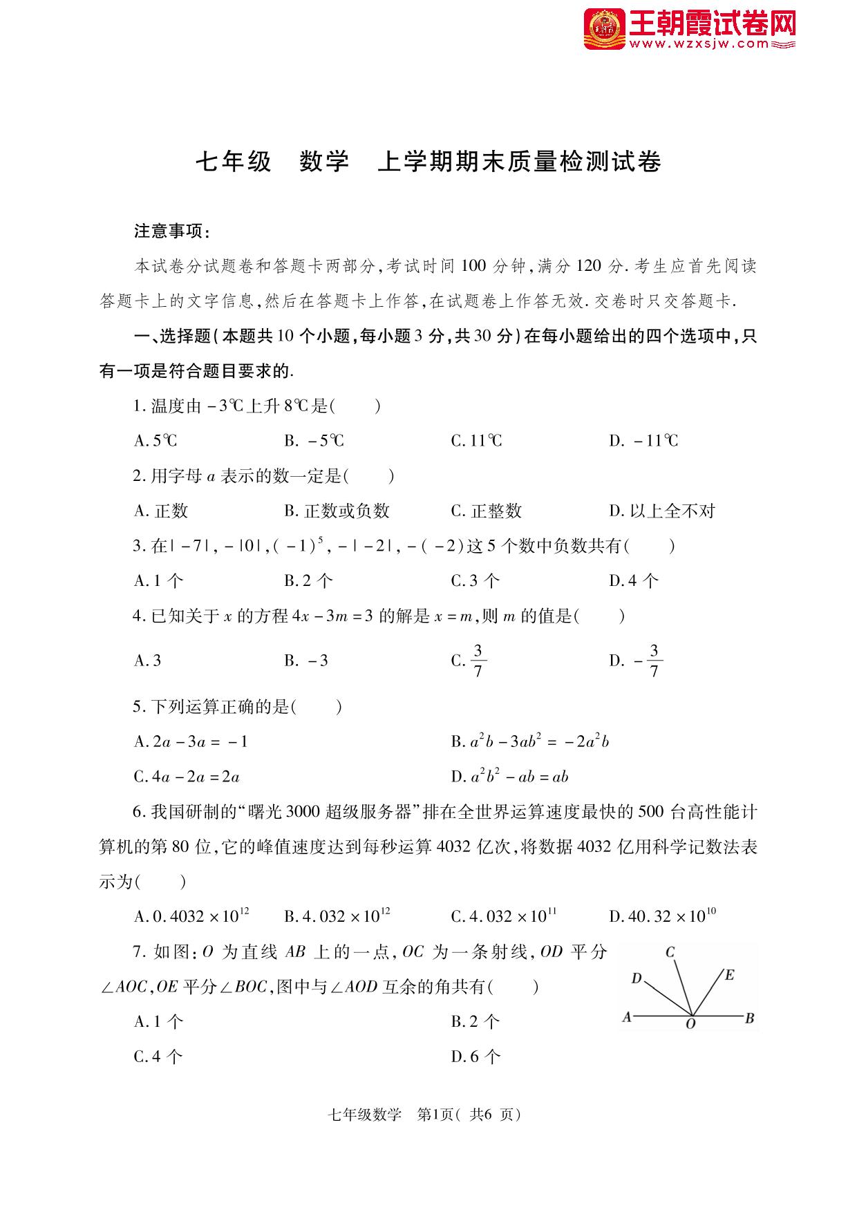 河南省郑州市巩义市2023-2024学年上学期期末质量检测试卷七年级数学(人教版)