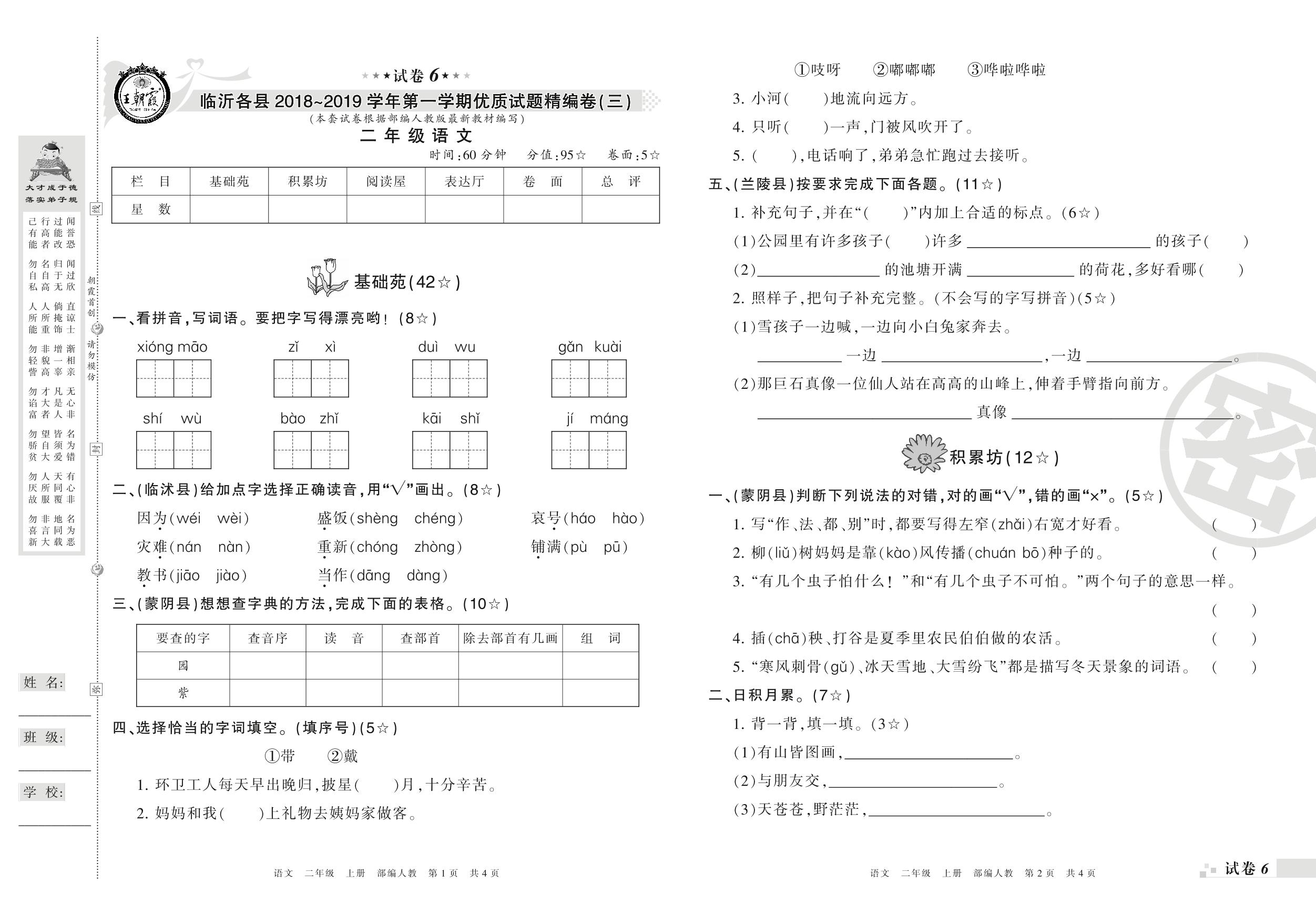 2018-2019学年第一学期临沂各县优质试题精编卷(三)二年级上册语文(人教版)_R21080171145【6】