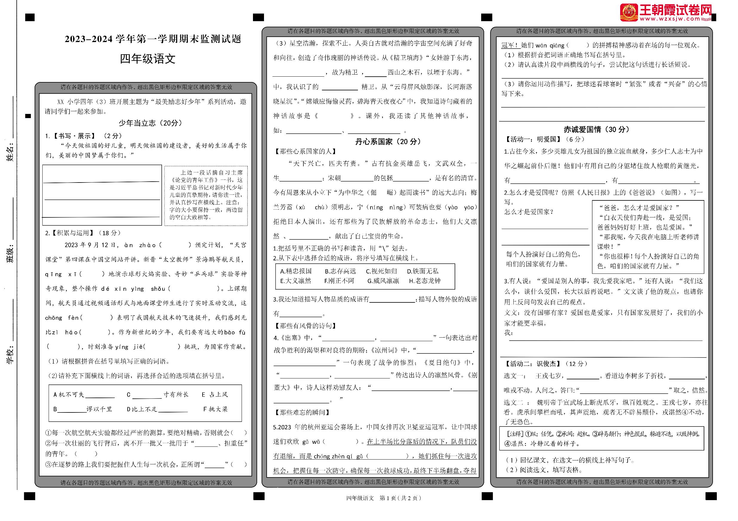 山西省大同市2023-2024学年第一学期期末监测试题四年级语文(人教版)