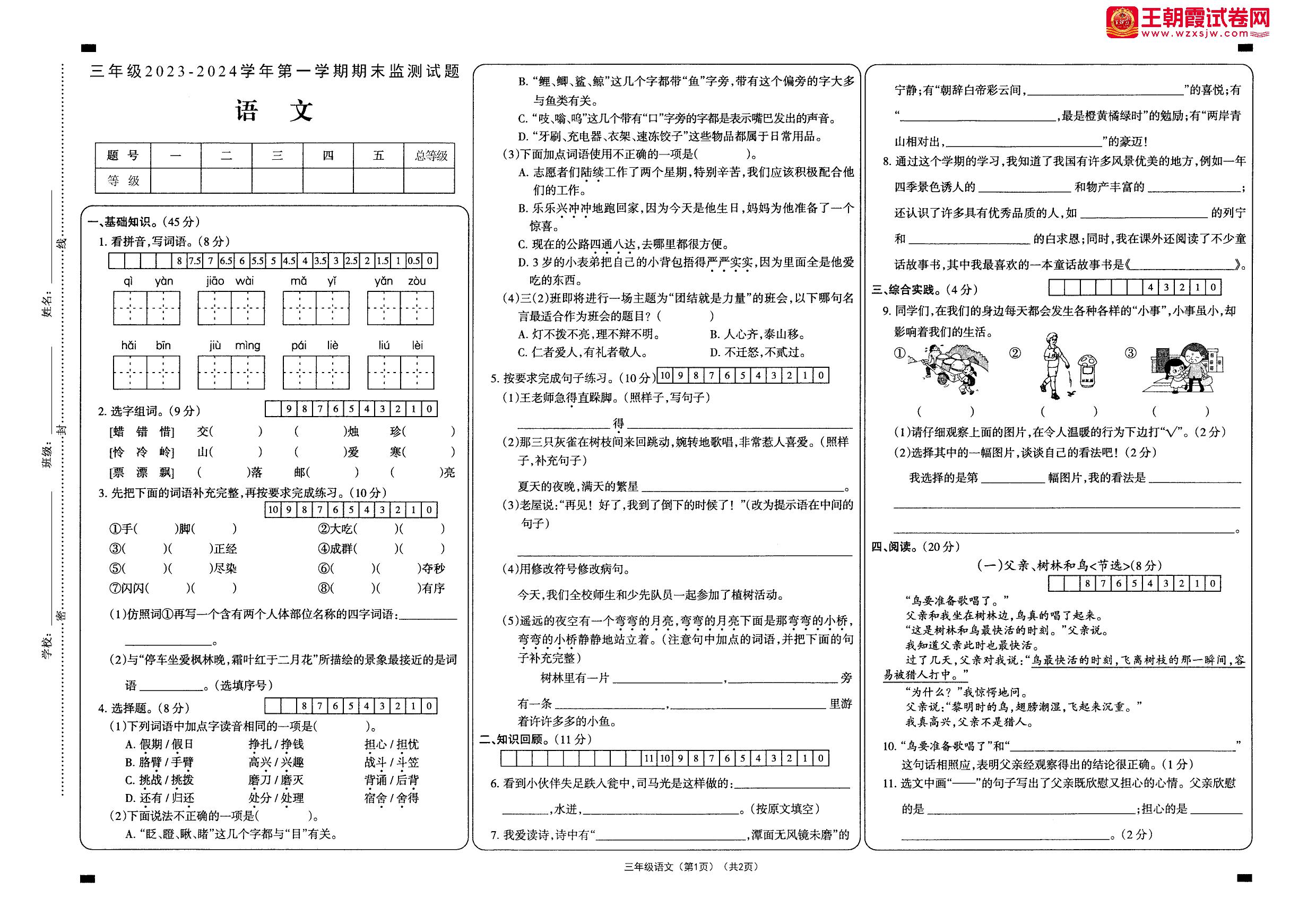 三年级语文人教版上册期末卷