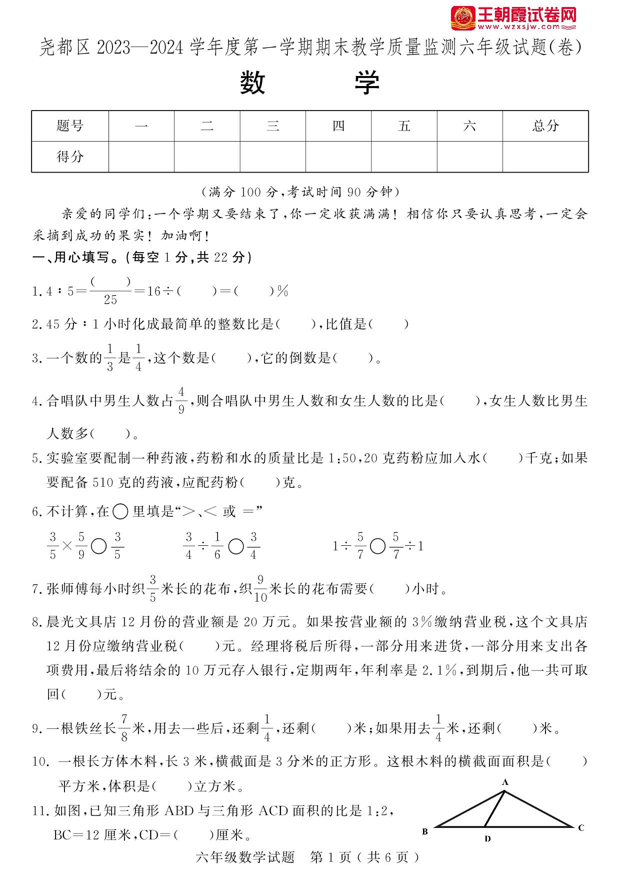 山西省临汾市尧都区2023-2024学年度第一学期期末教学质量监测六年级数学(苏教版)