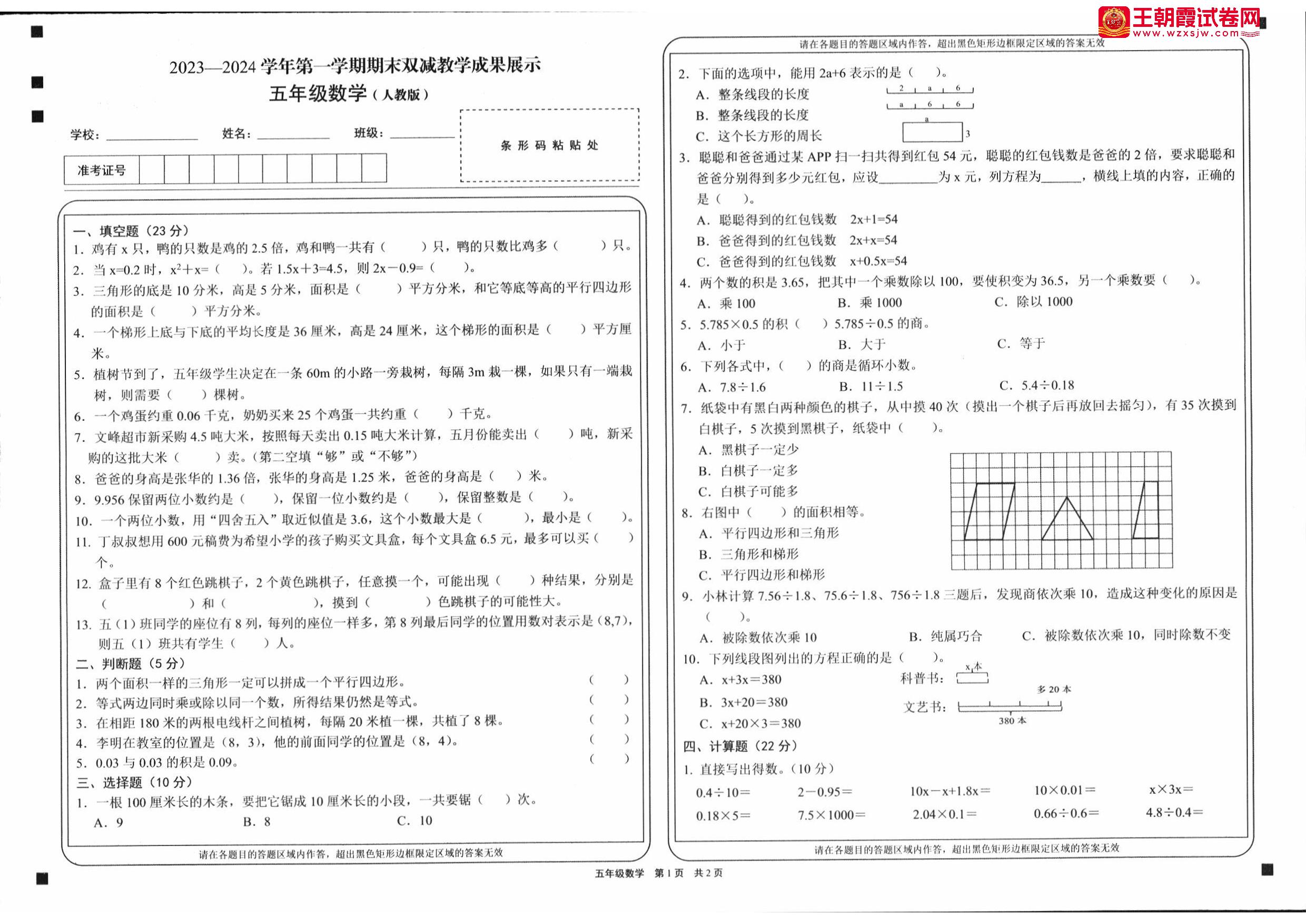 山西省忻州市2023-2024学年第一学期期末双减教学成果展示五年级数学(人教版)