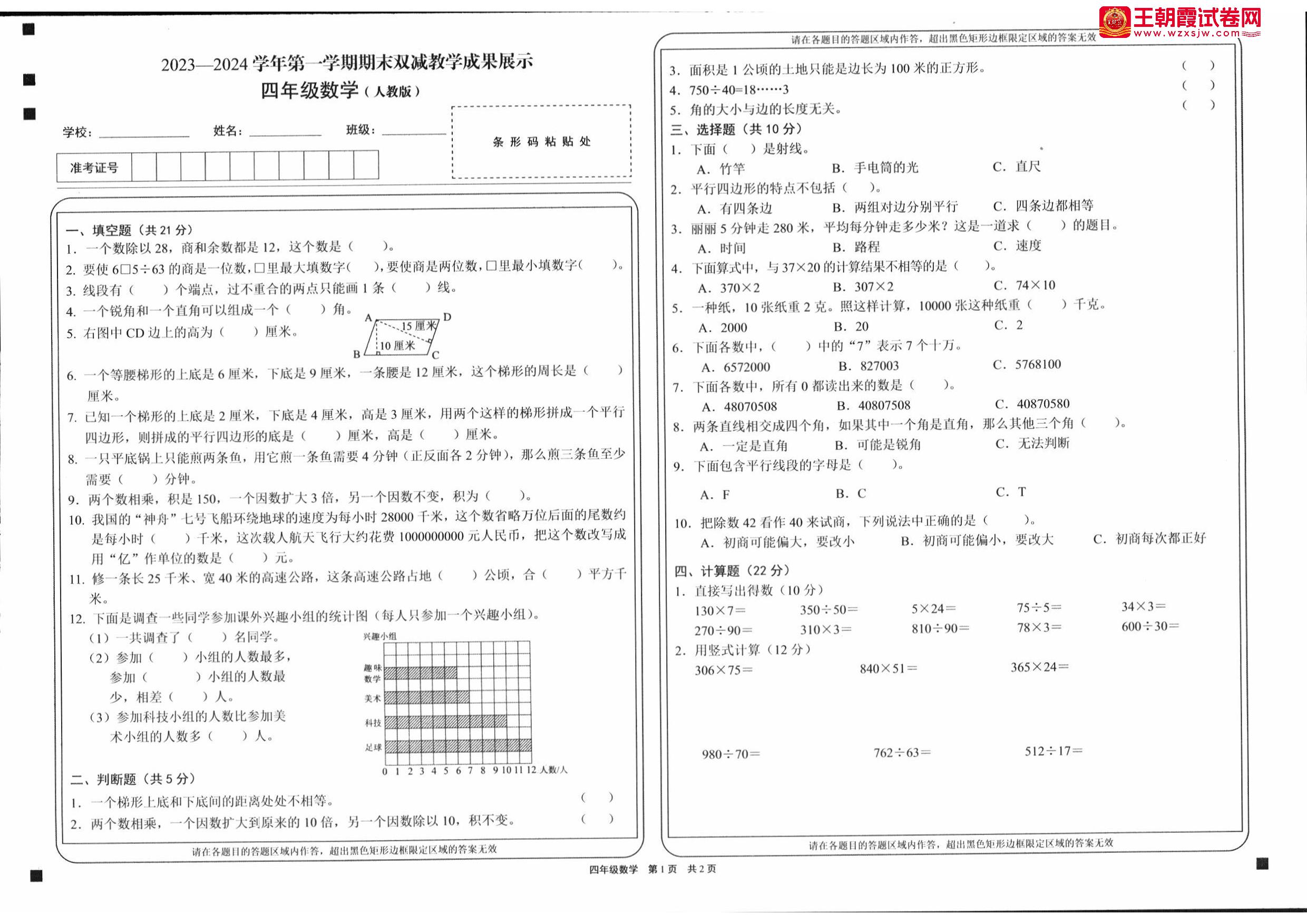 山西省忻州市2023-2024学年第一学期期末双减教学成果展示四年级数学(人教版)