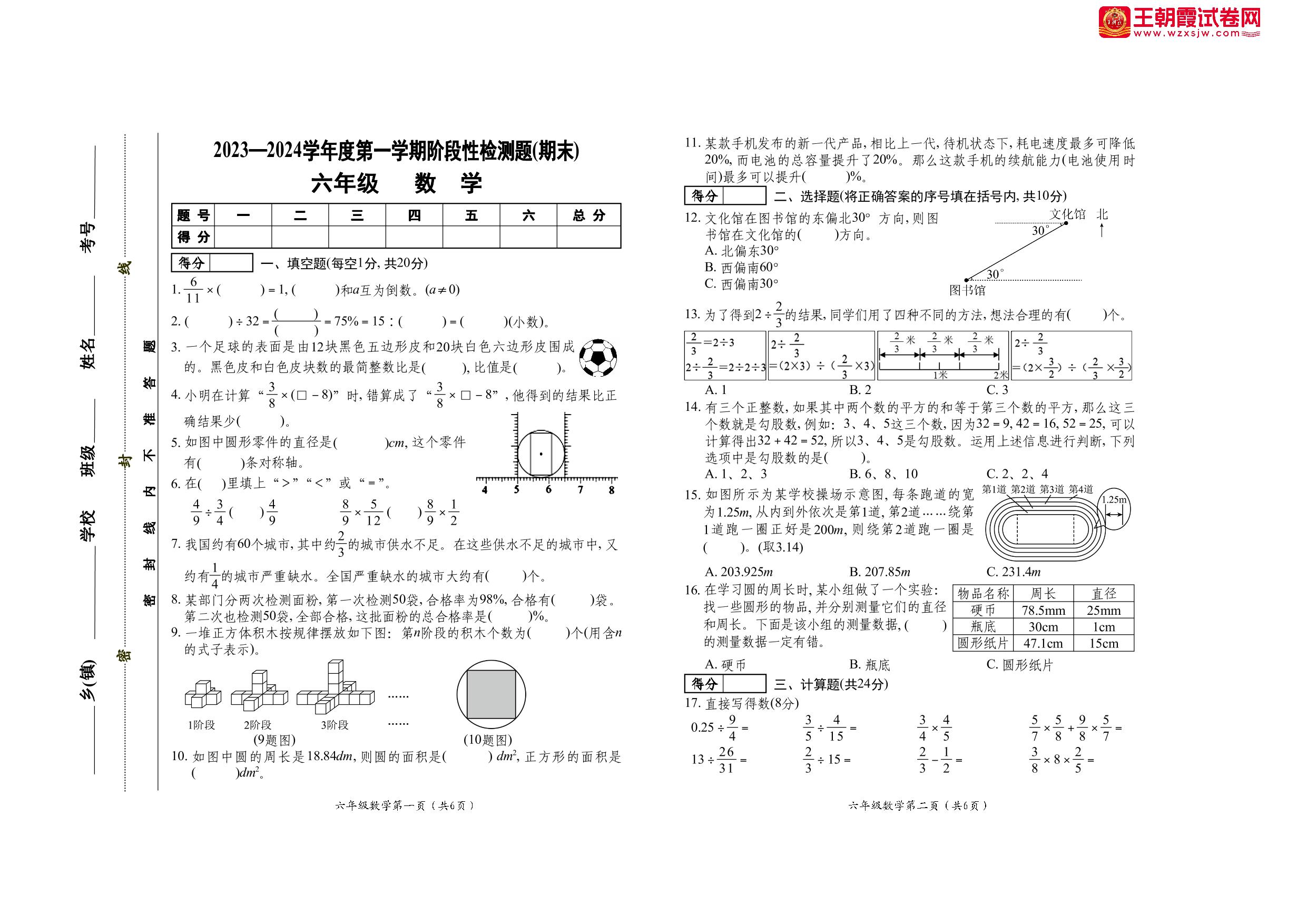 山西省晋中市祁县2023-2024学年度第一学期阶段性检测题(期末)六年级数学(人教版)