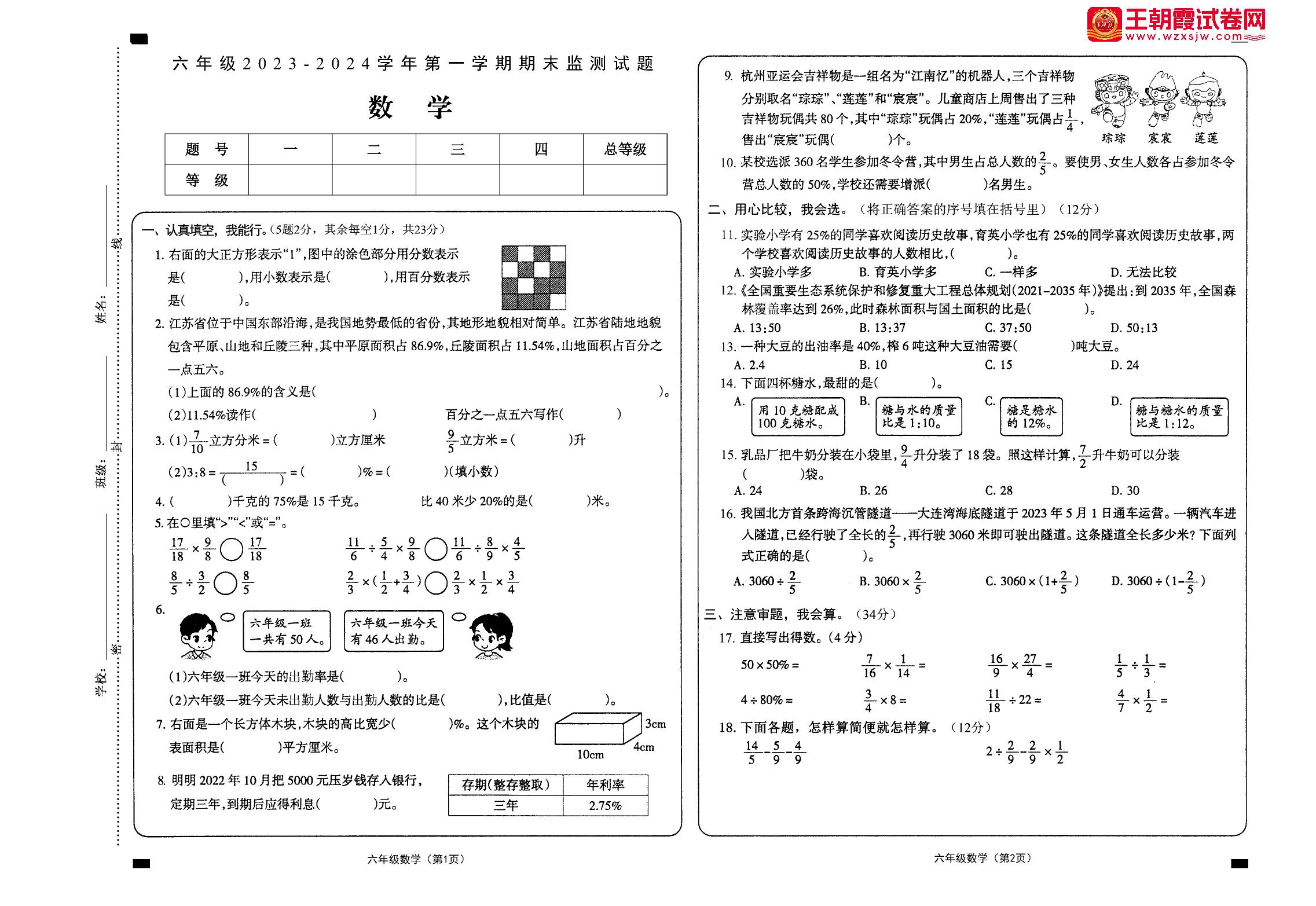 山西省大同市2023-2024学年第一学期期末监测试题六年级数学(苏教版)