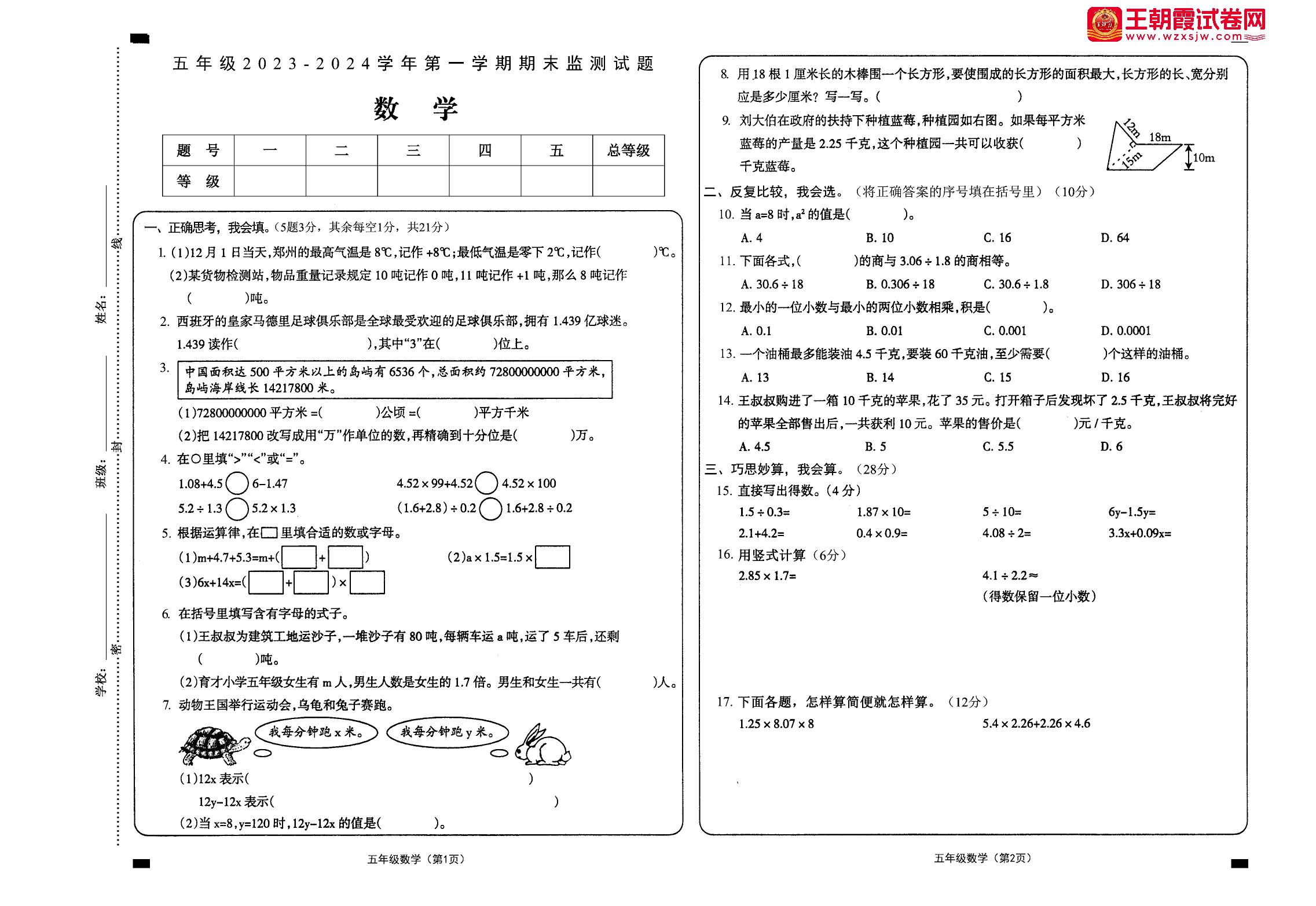 五年级数学苏教版上册期末卷