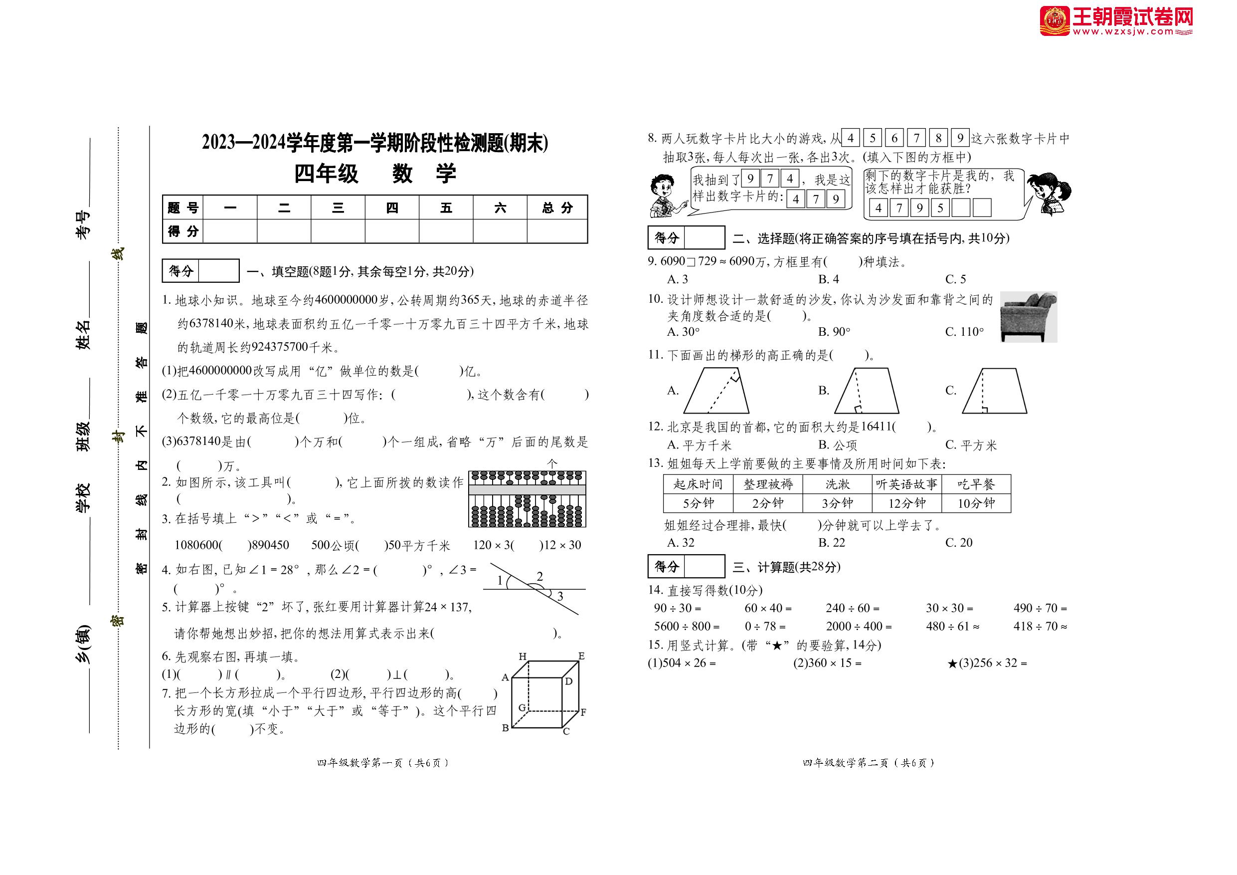 山西省晋中市祁县2023-2024学年度第一学期阶段性检测题(期末)四年级数学(人教版)